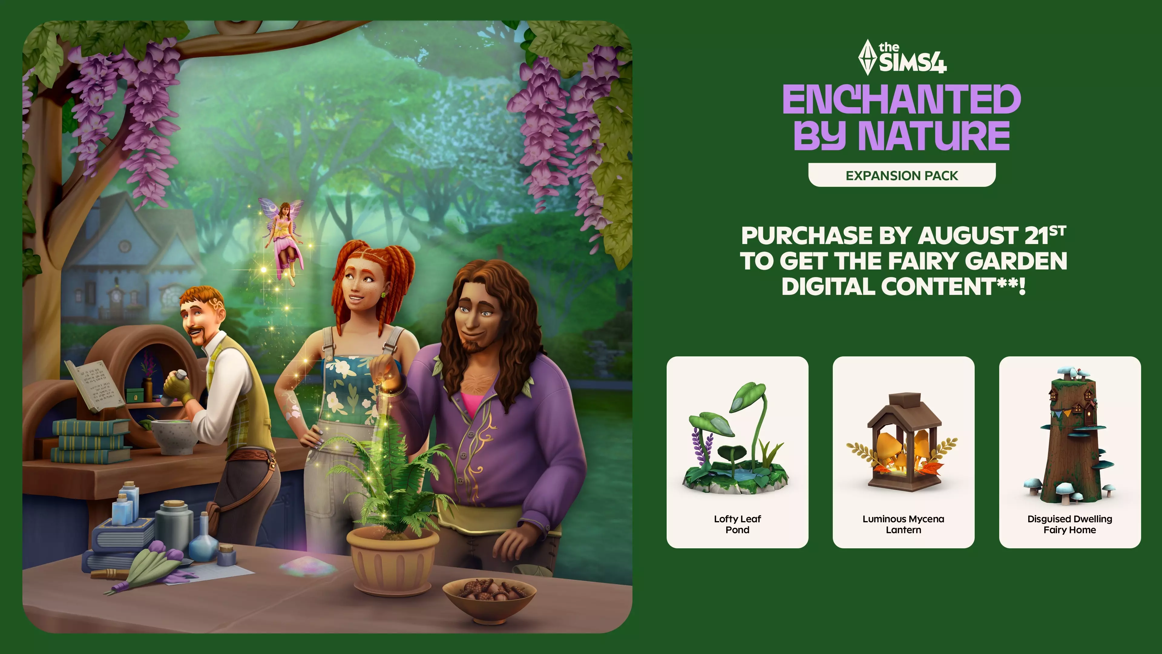 预购《模拟人生4》自然魔法扩充包*,7月10日正式发售!8月21日前预购可获得仙境花园数字内容**,内含高耸叶池、发光小菇灯笼和伪装精灵小屋。