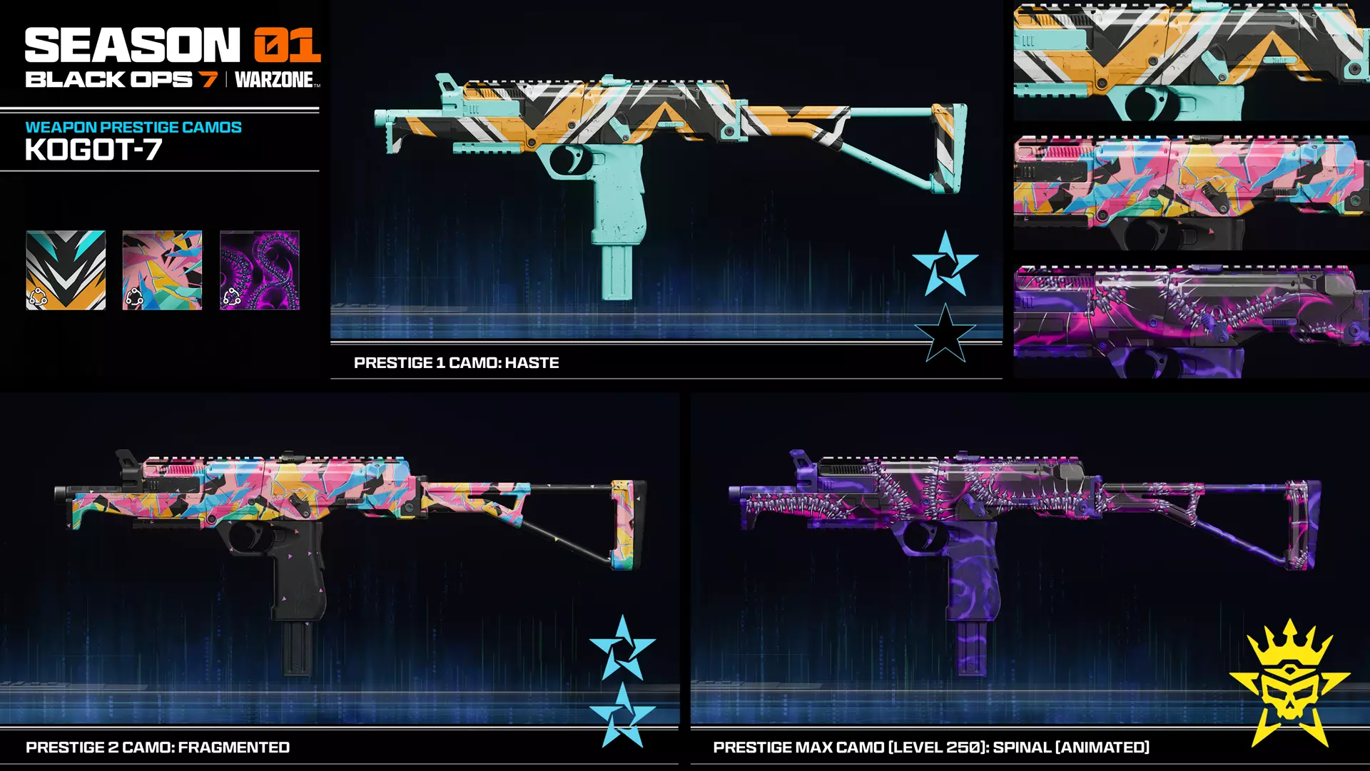 【使命召唤】通用内容摘要(所有模式和游戏) 武器详情:本季度将推出多款新武器,助你对抗敌人,包括Kogot-7冲锋枪、Maddox RFB突击步枪、Sokol 545轻机枪、NX Ravager十字弩、弹道刀、Sturmwolf 45冲锋枪以及Hawker HX狙击步枪。此外,还可获取新配件,如秋田烈焰双持霰弹枪、特殊的Redwell Shade-X抑制器枪口等。 新活动与奖励:参与新活动赢取奖励,其中包括社区活动,挑战所有人共同完成社区任务以达成目标。第一赛季活动奖励包括迷彩、干员皮肤、蓝图等,以及解锁的配装,其中有NX Ravager Special、Sokol 545轻机枪、Hawker HX狙击步枪等! 战斗通行证与BlackCell:第一赛季推出全新战斗通行证,在免费和付费等级中加入新的武器蓝图、干员皮肤、名片、终结技、表情等内容。 获取BlackCell可获得额外奖励,包括专属“Scorn”干员及其皮肤。 第一赛季干员:通过战斗通行证获取Dorne,或通过BlackCell获取Scorn,他们已整装待发,准备在所有游戏模式中称霸。 每周挑战:在整个赛季中完成每周挑战,以解锁新的配装物品、迷彩奖励和经验值。新商店商品:通过全新的CDL启动包来表达你对使命召唤联赛的支持,同时还有其他新商店内容,如制空权捆绑包和死亡游侠捆绑包等。 武器详情 主武器:Kogot-7(初始武器) 冲锋枪,战斗通行证第3页,第11页HVT等级战斗通行证蓝图