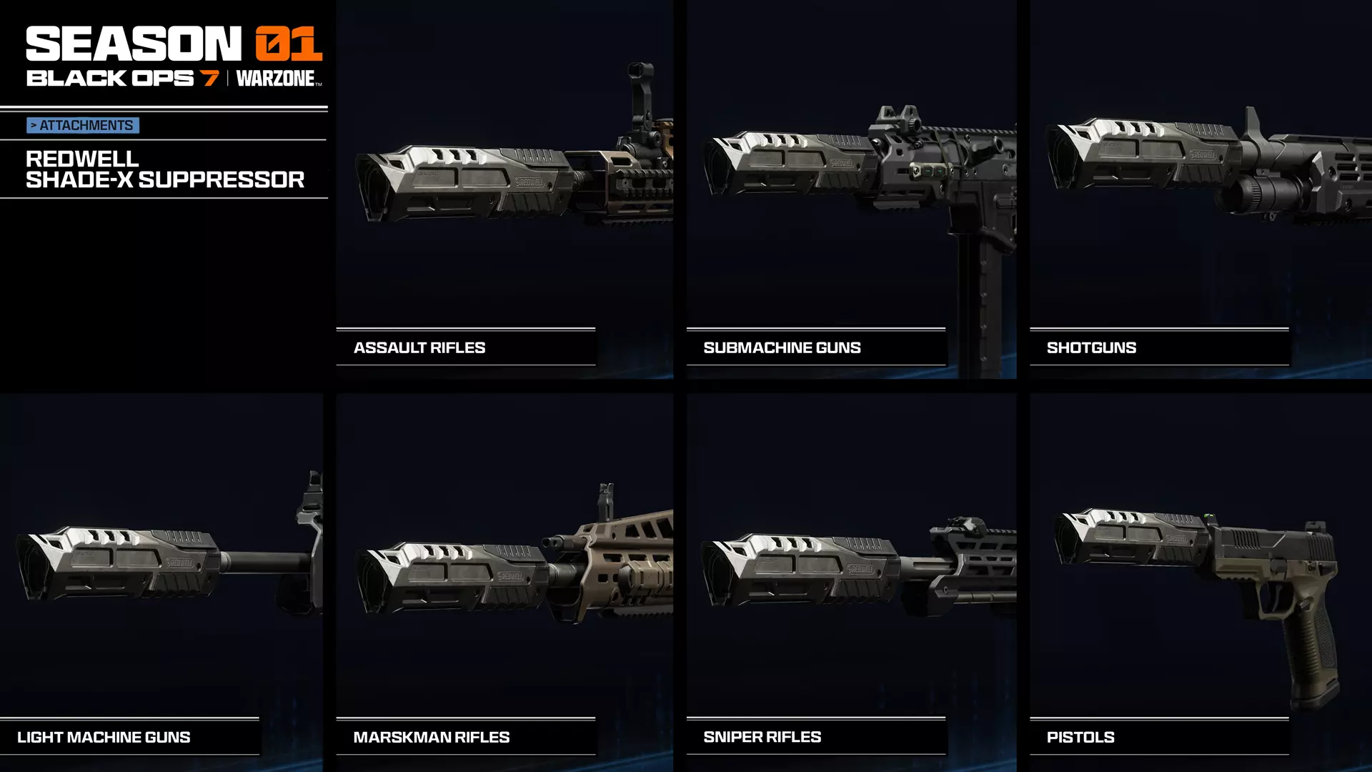 既然可以使用两把全自动霰弹枪,为何只使用一把呢?装备此配件后,你将获得双持能力,同时配备弹链供弹容量和过热机制,作为对弹药倾泻的平衡,其伤害范围和腰射散布会略有降低。此配件会阻止装备其他弹匣。 雷德威尔暗影-X消音器(赛季内) 所有可装备枪口配件的武器,周挑战奖励 配件>枪口>战术改装:雷德威尔暗影-X消音器