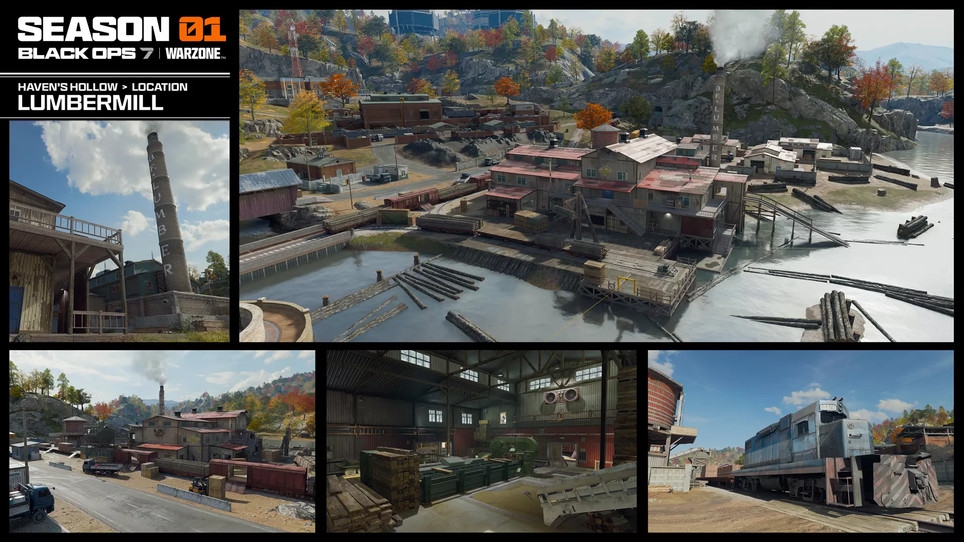 煤炭仓库呈阶梯状向下倾斜,通向 lumbermill,这两个区域共同构成了 haven hollow 的工业区。煤炭仓库鼓励玩家进行富有创意的战术玩法;利用这里的轨道、火车车厢、煤堆和室内空间来设置侧翼攻击和伏击。探索中央仓库获取战利品,或登上屋顶俯瞰整个区域。若想保持低调,可以前往两侧的小型建筑之一。 lumbermill