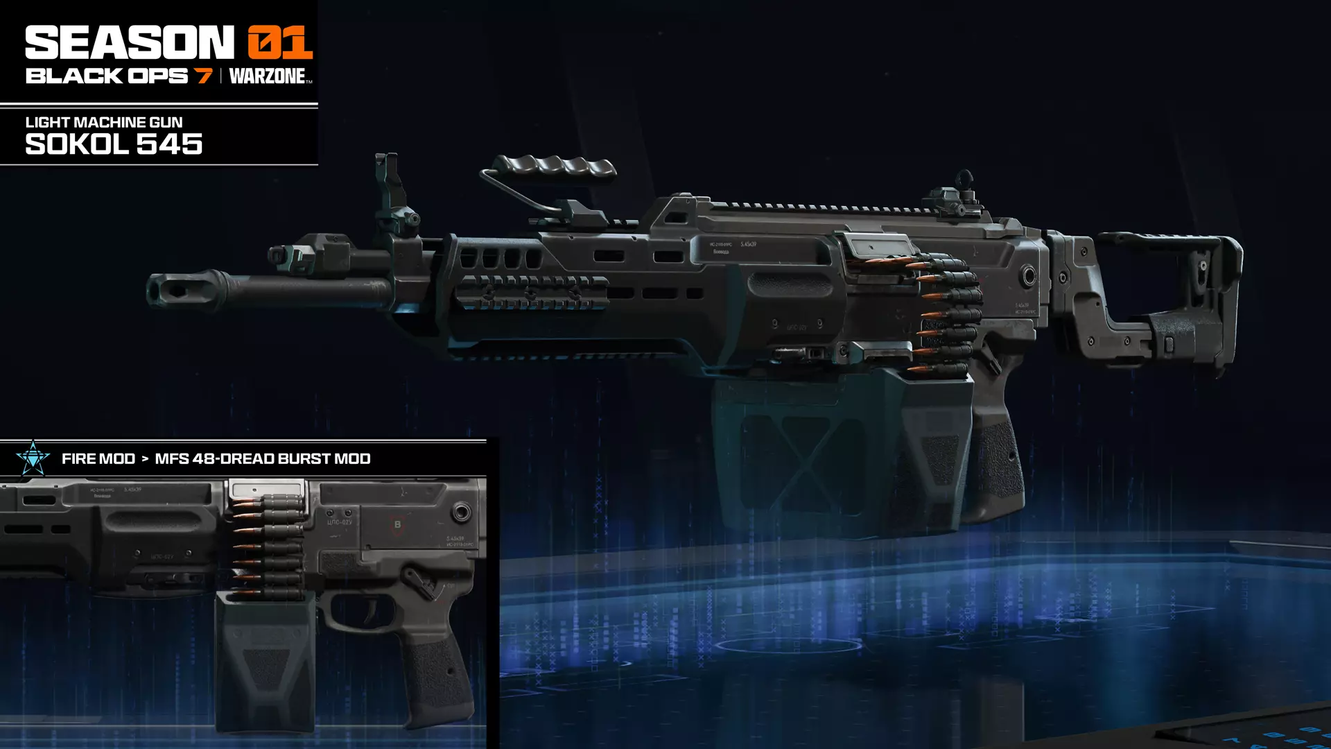 等级:39 弹匣数量:3 弹匣容量:102 精通徽章:有 配件:瞄具、枪口、枪管、下挂、弹匣、后握把、枪托、激光、射击模式 自定义选项:皮肤、迷彩和准星解锁(CM、MP、ZM、WZ)、附件(1个)、贴花(1个)、贴纸(3个) 全自动轻机枪。可根据需求在较低射速(高精度和射程)与较高射速(较高伤害和后坐力)之间切换。 当你需要压制火力时,很少有武器能超越索科尔545轻机枪。这是一款性能强悍的武器,基础弹匣容量超过100发,为同类武器中最大。它还拥有最远的伤害衰减距离,是压制敌方狙击手的理想选择。对于那些希望在持续战斗中掩护队友并保持压制的玩家来说,这是理想的武器,它配备两种射速切换模式,几乎能应对各种战斗情况。 声望配件 火力模式>速射模式:MFS 48-恐惧爆发模组