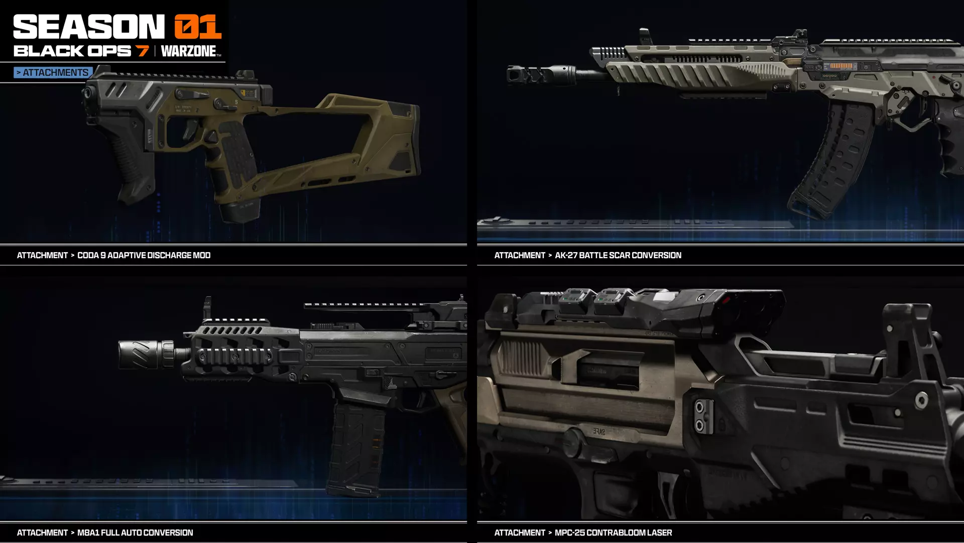 购买战斗通行证后,你将立即解锁即时奖励页面,包含以下物品: - 10%战斗通行证经验值加成 - 瞄准镜配件的【Linked】准星 - X9 Maverick突击步枪的【Chain of Command】传说蓝图 - 武器的【Rank and File】大型贴纸 - 多恩的全新【Adjutant】干员皮肤,购买BlackCell的玩家还可获得【Adjutant BlackCell】变体。该干员也将解锁供你使用。 第01赛季战斗通行证包含119个可解锁内容(不含BlackCell),其中包括两把全新(且免费)的基础武器等。请确保关注以下页面以获取这些武器: - 免费解锁:Kogot-7冲锋枪:完成第3页奖励 - 免费解锁:Maddox RFB突击步枪:完成第6页奖励 第01赛季战斗通行证完成奖励 购买并完成第01赛季战斗通行证的玩家将获得以下页面完成奖励: - 200 COD点数 - AK-27突击步枪的【Dissonance】传说蓝图 - 【No Slowing Down】动态名片 - 【Energized One】动态徽章 - 一张【Gift Card】终极 GobbleGum - Dorne的【Disharmony】角色皮肤,购买BlackCell的玩家还可获得【Disharmony BlackCell】皮肤 BlackCell内容