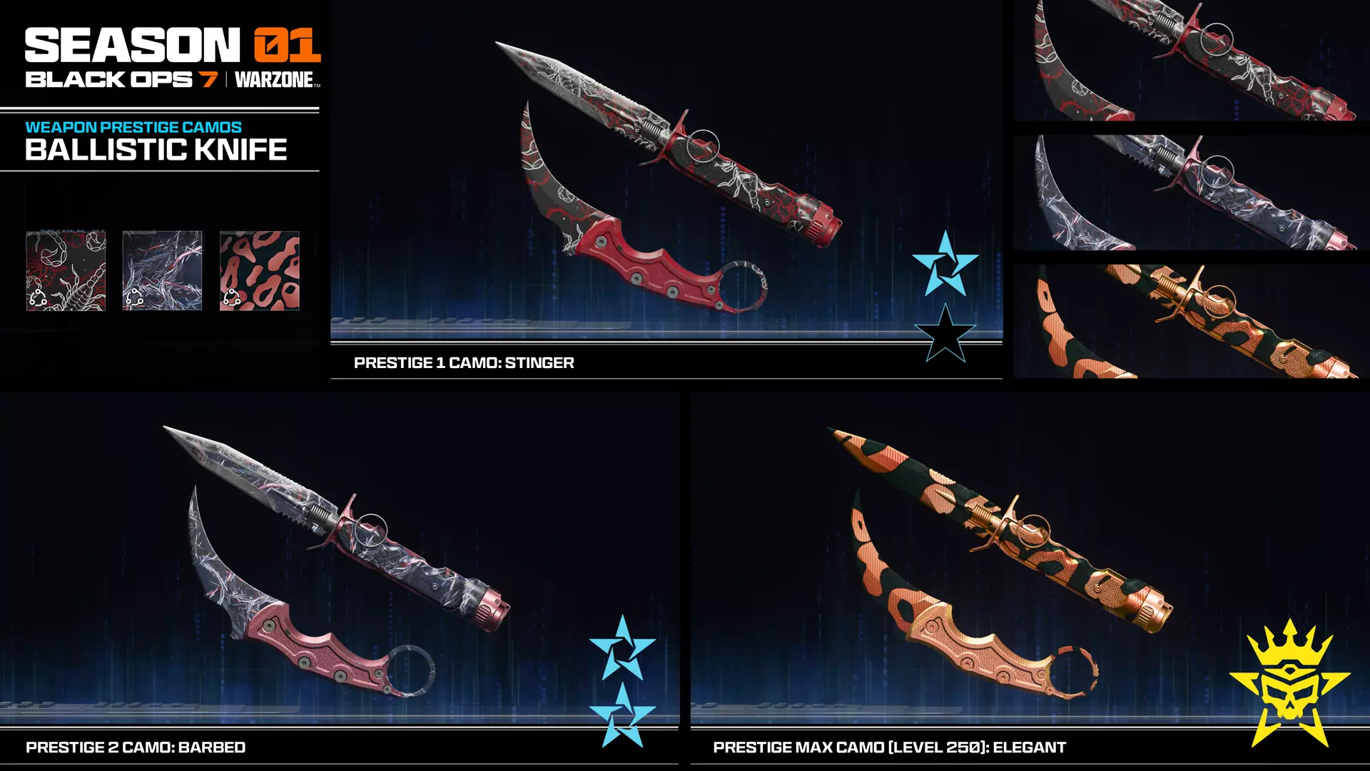 在赛季的每周完成挑战,即可解锁新的配装物品、迷彩奖励和经验值。从第一赛季开始,可通过大厅或生涯菜单中的挑战中心进入每周挑战菜单,你将有机会通过完成所有模式下的挑战来获取新的配件、连杀技能、武器等奖励。 注:第一赛季中额外提供的六个配件中,前两个已在本博客前文介绍。 第一赛季开始时,请立即查看每周挑战菜单,了解可用奖励以及获取这些奖励所需完成的挑战。在任意(或全部)四种支持模式——合作战役、多人对战、僵尸模式或使命召唤:战区中完成任意六个挑战,即可解锁每周配装奖励。请于次周再次查看菜单以获取下一个游戏奖励。 完成挑战还会奖励经验值,这是提升等级的绝佳途径。如果错过了某一周也无需担心;只要你在第一赛季期间的任意时间游玩《使命召唤:黑色行动7》,所有之前的每周挑战及奖励都仍可获取,直至赛季结束。 第一周奖励:弹道刀:在第一赛季的第一周,你的奖励是一把全新的近战武器:请务必快速完成每周挑战以解锁弹道刀!季节性迷彩(每周挑战)