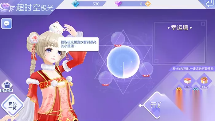 超时空极光:和魔力水晶球一样,每天玩家都有免费抽取机会,额外抽取可以通过极光抽奖抵用券或者紫钻来参与。超时空极光玩家也可以使用“我的奖励”“物品一览”功能,通过抽取玩家主要可以获得高档染色材料,以及可以兑换服饰道具的“海洋之星”。为了保证每个玩家不成为“非酋”,所以累计抽奖达到一定次数,玩家都可以领取到礼盒,其中包括点券和金币奖励。