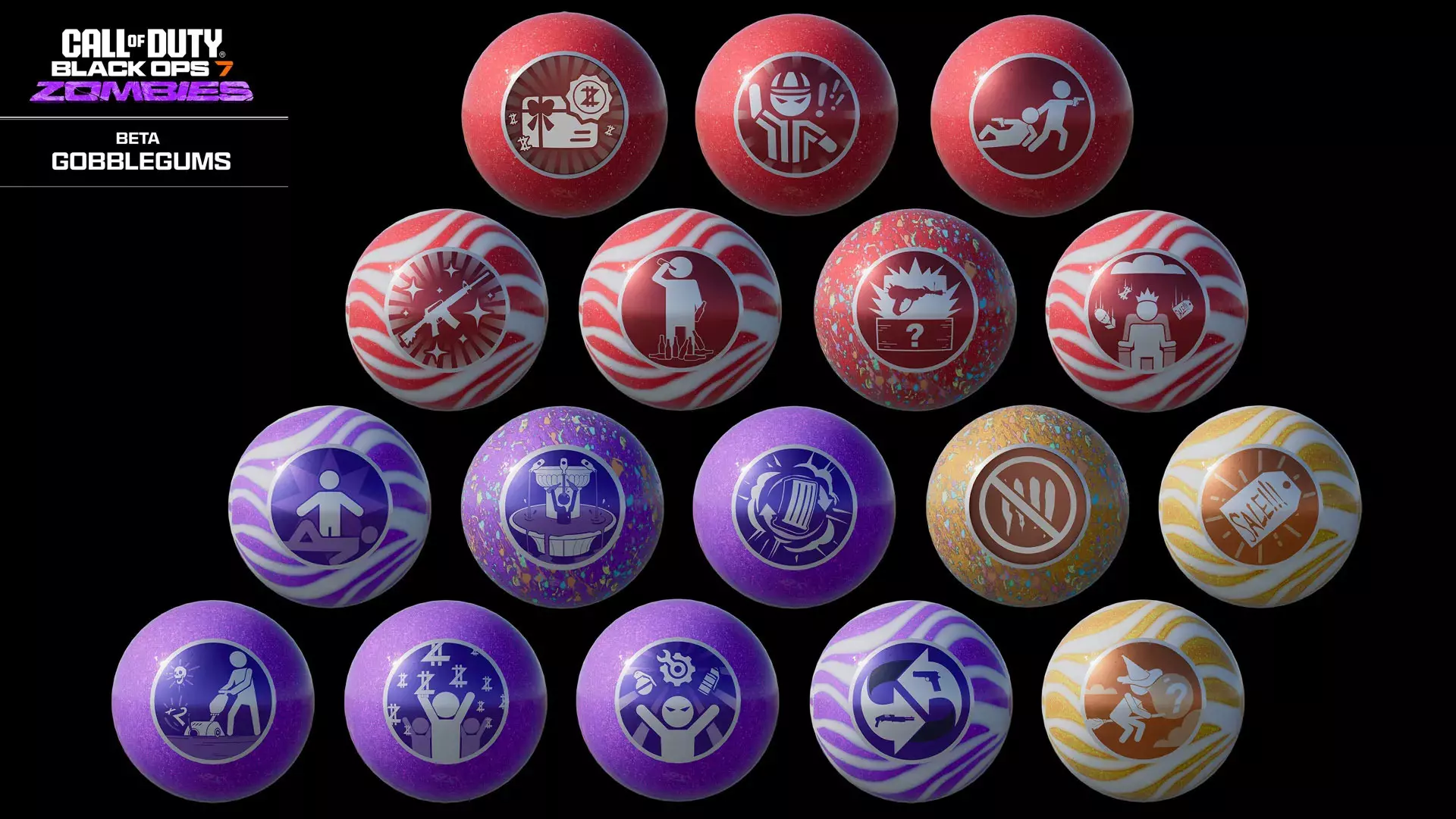 以下是一些值得关注的信息:在10月3日开始的测试版僵尸生存模式期间,将提供一批仅限测试版使用的特殊嚼嚼糖,且该模式限时开放。测试期间玩家可使用的嚼嚼糖不会影响测试版外的嚼嚼糖库存。这些嚼嚼糖是免费提供的,仅在测试版期间可用(因此请在测试版结束前使用,否则将失效!),目的是让玩家在僵尸生存模式中试用它们,并了解它们在该模式下的作用。 要了解每种嚼嚼糖的具体功能,请查阅嚼嚼糖指南获取更多详情。以下是测试期间可用的嚼口香糖(GobbleGums): 能量真空(《使命召唤7:黑色行动》新增,史诗级) 击杀敌人有更高几率生成道具。 唯此一处(史诗级) 立即传送至随机倒地队友位置。立即复活附近队友。 利益共享(史诗级) (持续2分钟)你获得的精华有一部分会分享给附近队友,反之亦然。 汽水喷泉(史诗级) (购买 perk 时激活)下一次购买 perk 时额外获得一个随机 perk。 死亡空投(史诗级) (持续5分钟)战利品和装备的掉落率大幅提升。 爆炸 flourish(史诗级) (持续2分钟)换弹时在你周围产生爆炸。 重转循环(史诗级) 神秘箱中的武器确定后,重新转动以获得相同或更高稀有度的武器。Round Off(新增至BO7,传奇):阻止回合推进,持续两个回合。 Immolation Liquidation(传奇):生成一个火力全开道具。 Flavor Hex(传奇):给予玩家一张随机的超级嚼嚼糖。 Gift Card(新增至BO7,终极):获得30,000精华。无法与其他加成叠加。 Time Out(终极):清除所有普通和特殊敌人并结束当前回合。 Perkaholic(终极):给予玩家所有可用的 perk。 Hidden Power(终极):将你当前持有的武器升级为传奇稀有度。 Near Death Experience(终极):(持续3分钟或5次复活)通过靠近其他玩家来复活或被复活。被复活的玩家保留所有 perk。 Wonderbar!(终极):(在神秘箱抽取时激活)下一次从神秘箱中获得的武器将是奇迹武器。统治之雨(终极) 一次性生成所有核心强化道具。 COD 101