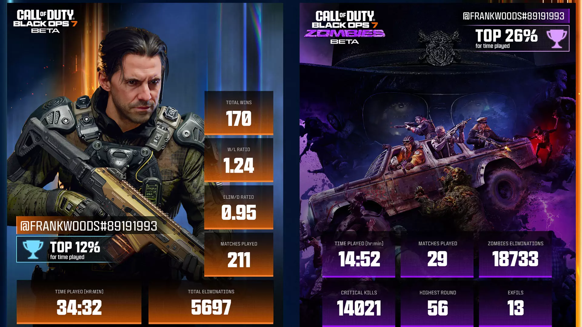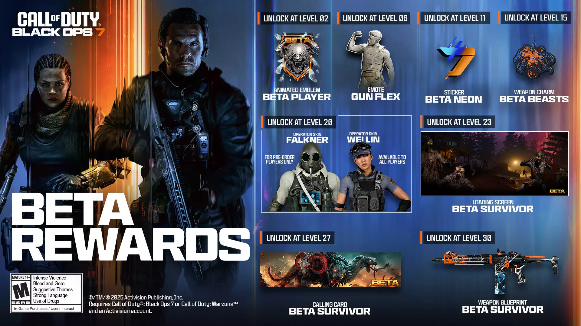 在多人公开测试期间达到玩家等级里程碑,即可获得一些令人难以置信的外观奖励,这些奖励将在整个多人公开测试期间保留,并在11月14日《使命召唤:黑色行动7》发售后可供你使用。奖励及所需等级如下: - 2级:【Beta玩家】动态徽章 - 6级:【枪械炫耀】表情 - 11级:【Beta霓虹】贴纸 - 15级:【Beta野兽】武器挂饰 - 20级:【Beta特立独行者】JSOC阵营角色皮肤 - 20级:【Beta领袖】公会阵营角色皮肤 - 23级:【Beta幸存者】加载界面 - 27级:【Beta征服者】名片 - 30级:【Beta传奇】武器蓝图-M15 Mod 0 追踪你的进度:Beta数据统计 使命召唤:黑色行动7 Beta测试不仅是你体验多人模式和僵尸模式的机会,也是你了解自己表现、展示进度以及与好友比较技能的机会。在测试期间,你可以查看自己的统计数据,并与更广泛的社区进行比较,了解自己的水平。参与方式如下: