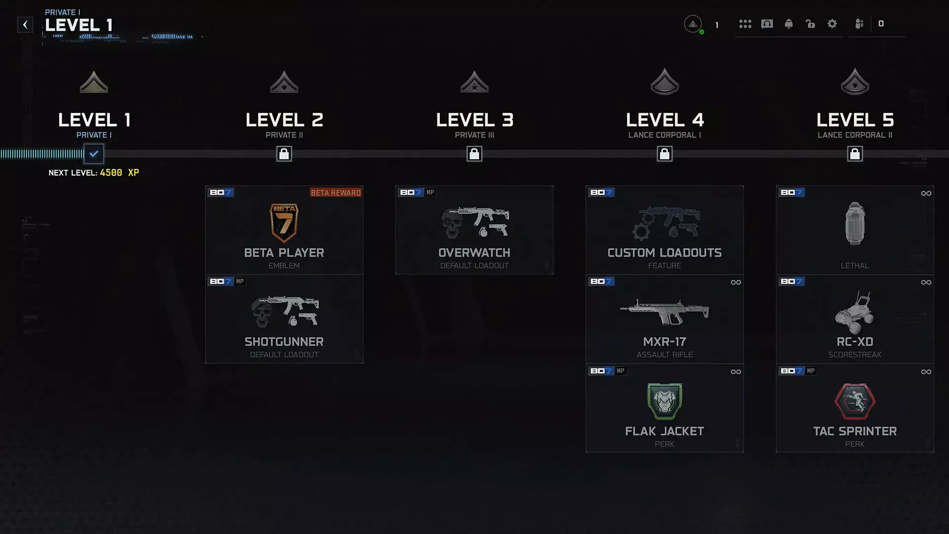 MXR-17(主武器,突击步枪) 解锁等级:一等兵一级(4级) 全自动突击步枪。具备出色的精准度和射程,但机动性和射速相对较低。 防爆夹克(特长,战略家) 解锁等级:一等兵一级(4级) 减少受到的爆炸和火焰伤害。 5级:进度解锁(一等兵二级) 粘性手雷( lethal装备) 解锁等级:一等兵二级(5级) 定时粘性手雷。 RC-XD(连杀技能) 解锁等级:一等兵二级(5级) 部署一辆小型遥控引爆爆炸载具。 战术冲刺(特长,执行者) 解锁等级:中士二级(11级) 允许使用战术冲刺,但降低普通冲刺速度。6级:进度解锁(下士III) 测试奖励 解锁条件:下士III(6级) 【“枪械炫耀”表情】