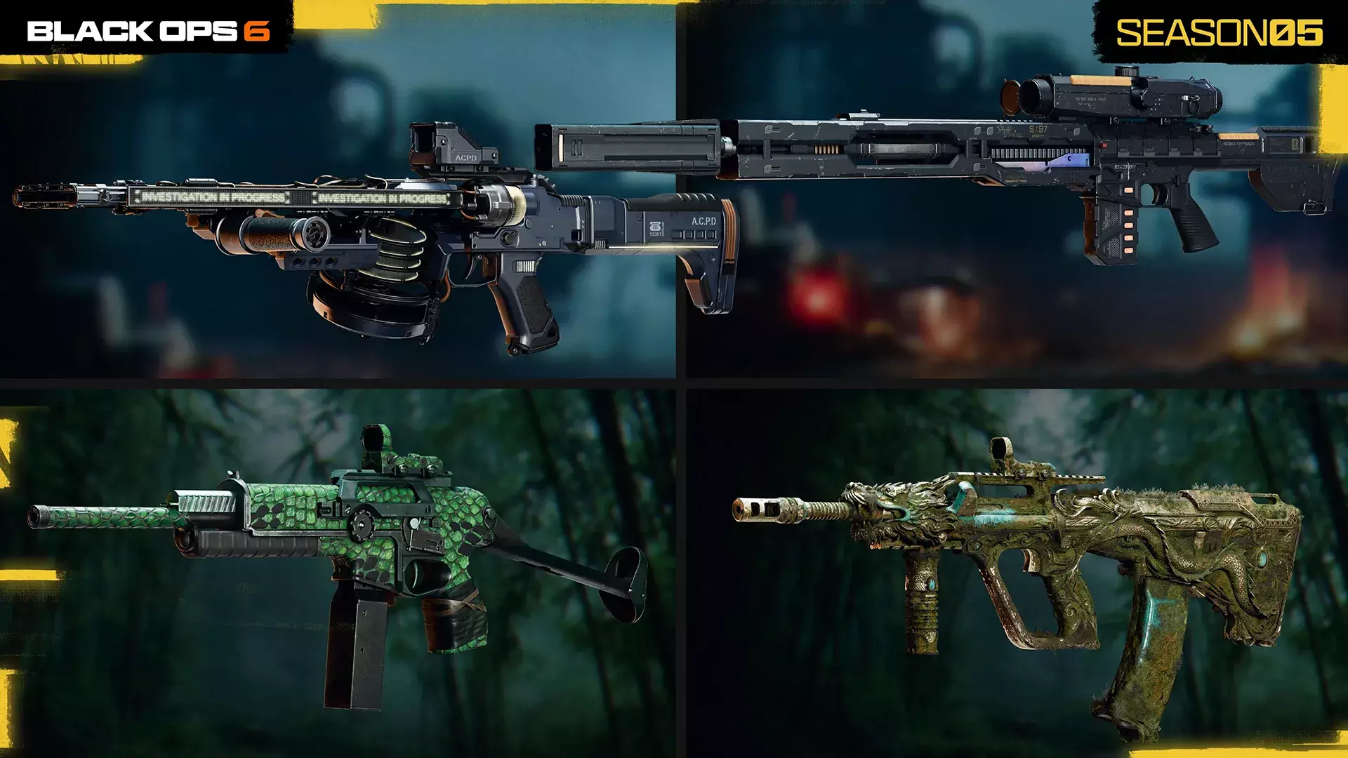 (上文)“紧凑弗里克斯”D1.3区域特供,第13页 “长臂”DM-10狙击步枪,高价值目标,第13页* “ wyrmscale”PP-919冲锋枪,第14页 “龙王”ABR A1突击步枪,高价值目标,第14页* 黑Cell蓝图 接下来,我们来看看七款配有动画黑Cell变体的武器蓝图,部分蓝图带有动画金色空灵飘带,以及金色光环弹道和金色灵魂击杀特效。