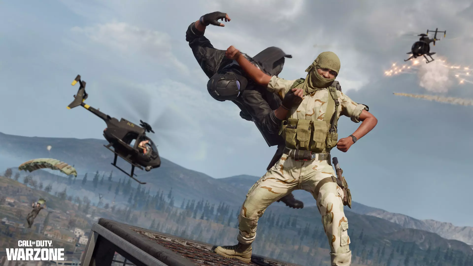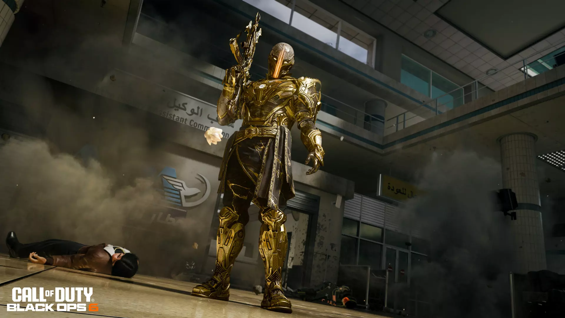 一名万神殿的内鬼试图通过阿尔扎克省机场逃跑。当黑色行动 rogue 小队追捕他们的最终目标之一时,一切都陷入了混乱。停机坪上散落着残骸和行李,火焰吞噬着航站楼的侧面,机场控制塔的大火中升起滚滚黑烟。