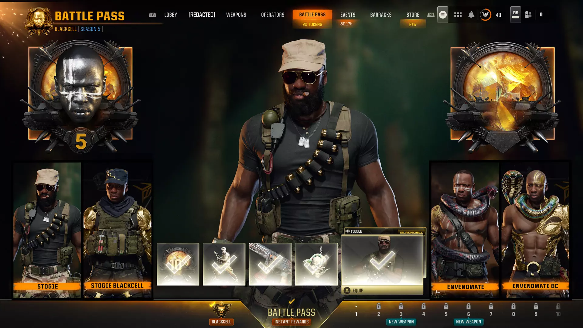 随着黑色行动 rogue 小队重新回归中央情报局,战术专家劳伦斯·西姆斯也从《使命召唤:黑色行动6》战役模式中回归,他将凭借自己的专业知识协助追捕最后的内鬼,并主导本季度的战斗通行证内容。购买1100 COD点数的第05赛季战斗通行证,或2400 COD点数的第05赛季战斗通行证组合包,即可立即解锁战斗通行证的即时奖励页面,包含以下物品: - 10%战斗通行证经验值加成 - 新的“斯托吉”希姆斯干员,购买黑Cell的玩家还可获得“斯托吉黑Cell”希姆斯干员皮肤 - Kilo 141突击步枪的“地狱火”传说蓝图 - “自由开火”表情 - “毒眼”武器挂饰 第05赛季战斗通行证包含超过110个可解锁内容(不含黑Cell),其中包括两把新的(免费)基础武器、9毫米PM碎颅者枪管配件等。请关注第五赛季上线前关于黑色战阶、战斗通行证和商店捆绑包的博客,以获取更多详情。 黑色战阶内容