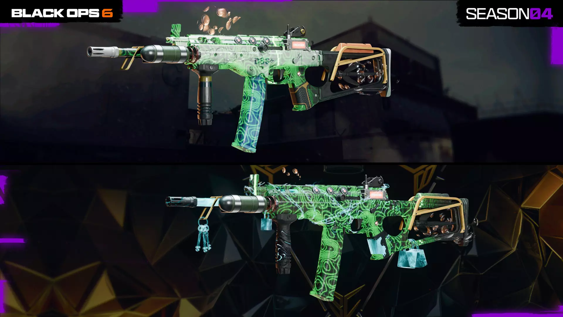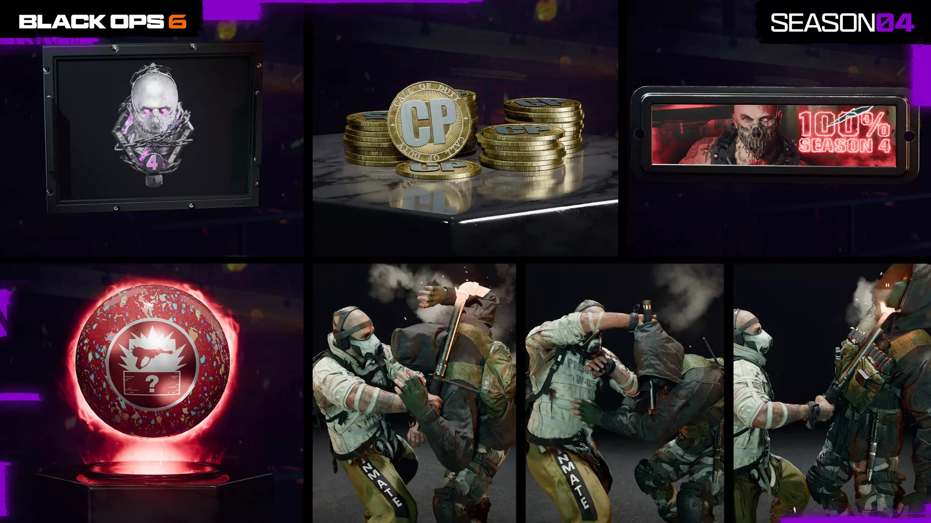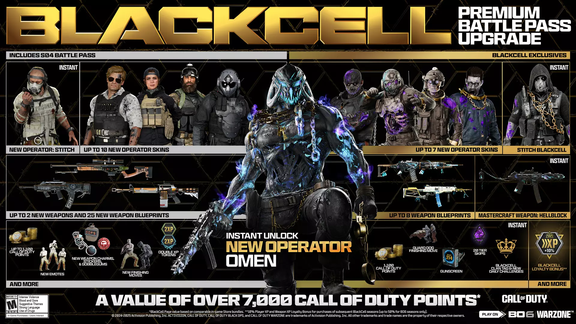 1100点使命召唤点数 20个战斗通行证等级跳级 “预兆”黑Cell干员及皮肤 10%经验值加成 Ladra冲锋枪的“地狱区块”大师级蓝图 “看门狗”同伴终结技 “击杀计数”枪械屏幕 “黑Cell”战队标签(在大厅和胜利结算界面展示) 黑Cell忠诚奖励 黑Cell所有者还可在第04赛季战斗通行证中解锁一页又一页的额外奖励,包括: 七款黑Cell专属皮肤: stitch(两款)、Bailey、Payne、Caine、Brutus和Adler 七款黑Cell专属武器蓝图:Krig C(突击步枪)、XMG(轻机枪)、SWAT 556(精确射手步枪)、ASG-98(霰弹枪)、FFAR 1(突击步枪)、Model L(突击步枪)、LC10(冲锋枪) 完全完成第四赛季黑色战阶的玩家可获得超过130项物品奖励(与战斗通行证和黑色战阶相关)。 购买战斗通行证后升级至黑色战阶的玩家还将获得1100点使命召唤点数返还。 黑色战阶每日挑战:拥有黑色战阶的玩家在第四赛季期间将获得额外的每日挑战,涵盖多人对战、僵尸模式以及《使命召唤:战区》,让你在游戏过程中有更多机会获取经验值! 黑色战阶忠诚奖励:后续购买黑色战阶赛季可获得10%的经验值和武器经验值忠诚奖励(仅《使命召唤:黑色行动6》赛季最高可达50%)。 购买战斗通行证:立即解锁“缝合者”干员