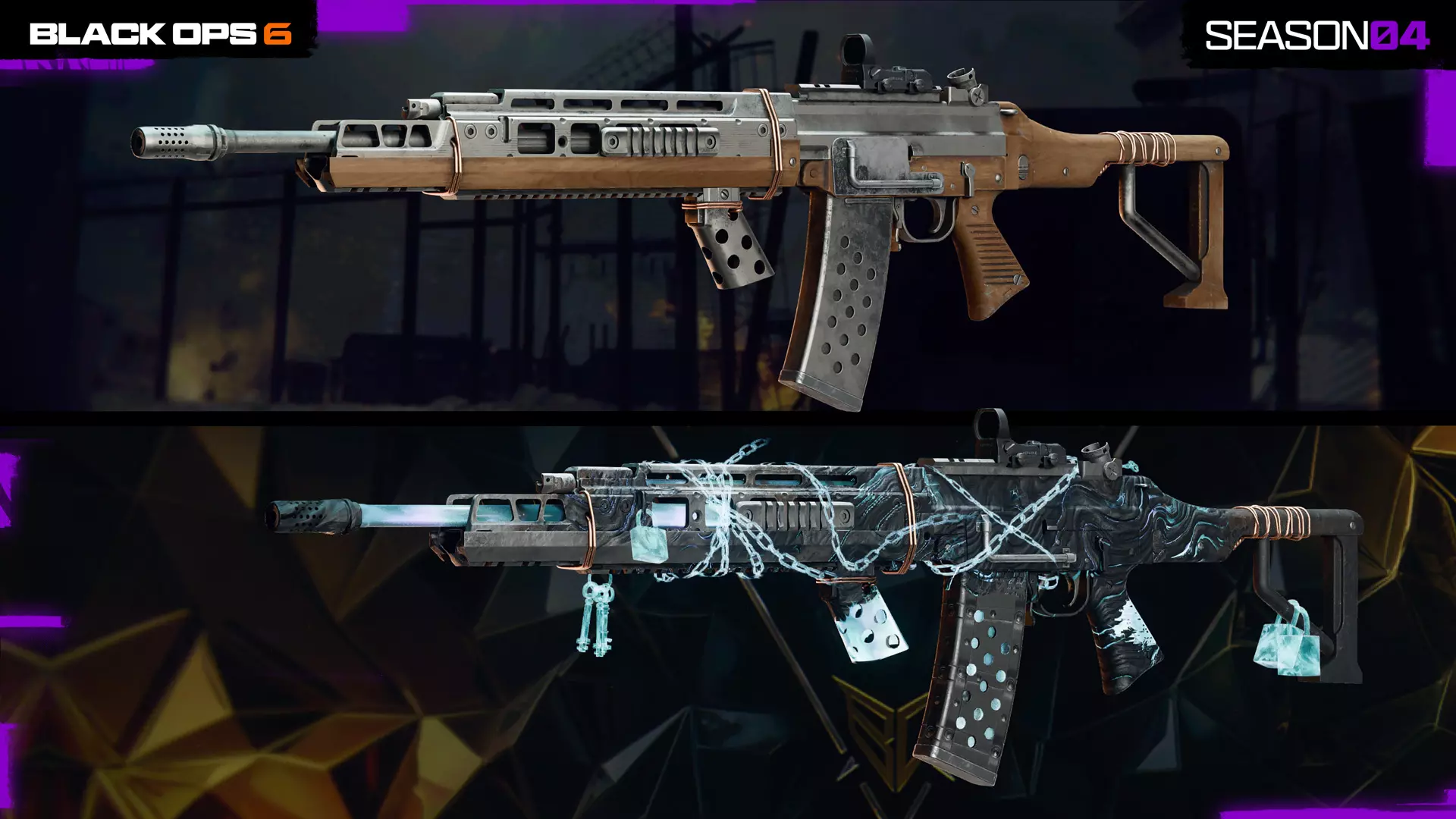 装备这款集成激光的垂直前握把可锁定并保持目标,提升射击稳定性、水平后坐力控制,并在腰射与瞄准镜瞄准切换时收紧弹道散布。光束颜色:蓝色。会占用激光配件槽位。 可解锁武器蓝图 第四赛季战斗通行证和黑色战令包含超过20个可获取的武器蓝图,其中包括以下主题武器: