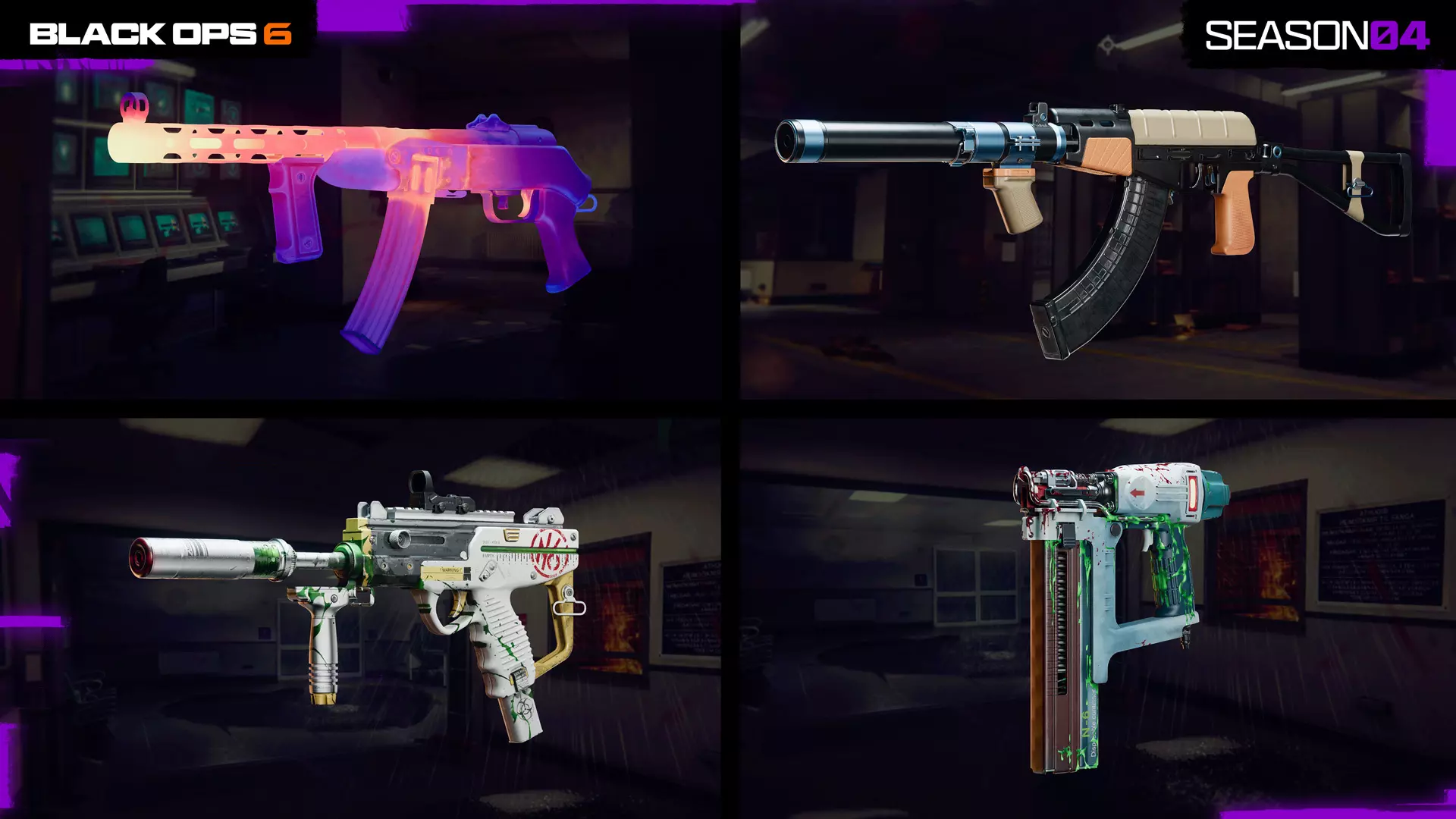 (上图) “Heat Signature” PPSh-41 冲锋枪,第2页 “Security Detail” AS VAL 突击步枪,第9页 “Overflow” Saug 冲锋枪,第12页 “Messy Repairs” 特殊钉枪,第12页