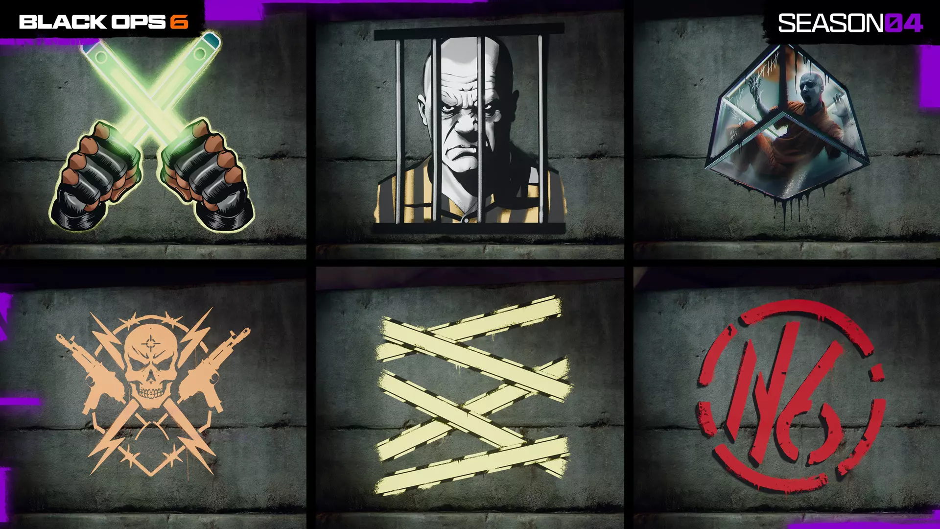 “Get Glowing”喷漆,第2页 “Mean Mug”喷漆,第3页 “Confined”喷漆,第5页 “Prison Crest”喷漆,第6页 “Stash”喷漆,第8页 “Yellow Tape”喷漆,第9页 “N6”喷漆,第12页 额外的战斗通行证内容