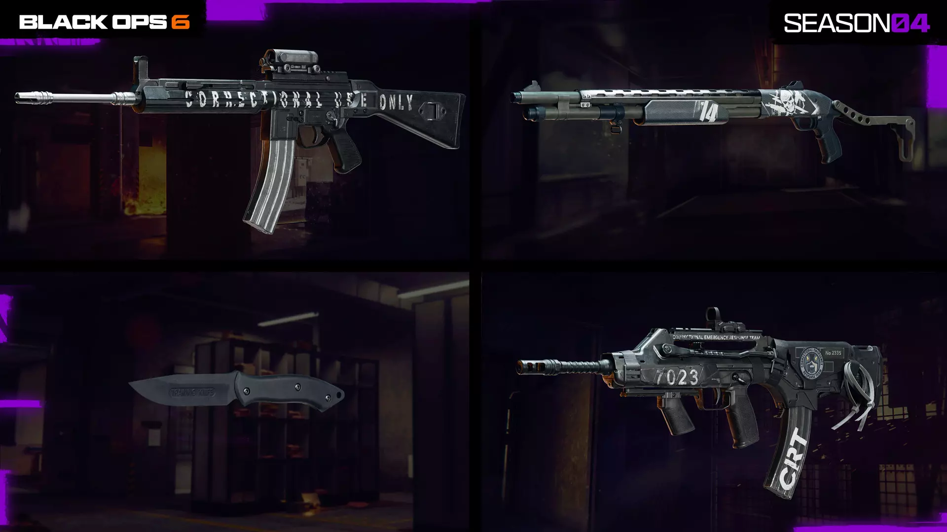(上图) “No Parole”型号L突击步枪,第4页 “Gen Pop Prop”海军陆战队SP霰弹枪,第6页 “Trainer”近战匕首,第9页 “Lockdown”FFAR 1突击步枪(新武器),第11页