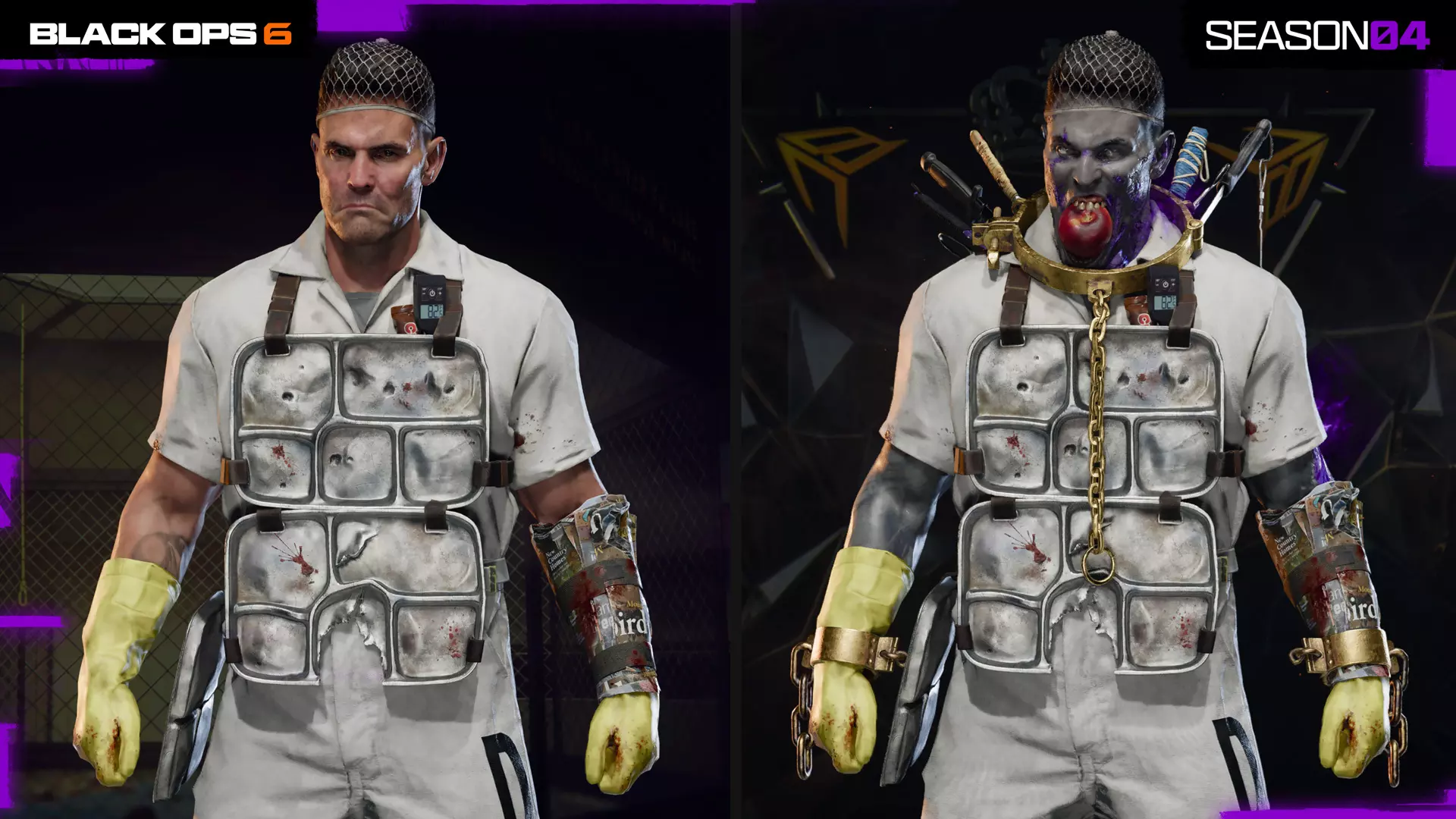 凯恩打扮成一名厨师,用手头的东西临时拼凑装备,将金属餐盘绑在躯干上,并用胶带把杂志固定成简易护手。在亡灵黑牢变体中,他嘴里叼着苹果,破损的皮肤冒着蒸汽,准备给敌人送上“痛苦大餐”。 布鲁特斯:“恐惧典狱长”皮肤 干员皮肤、战斗通行证与黑牢、高价值目标,第9页