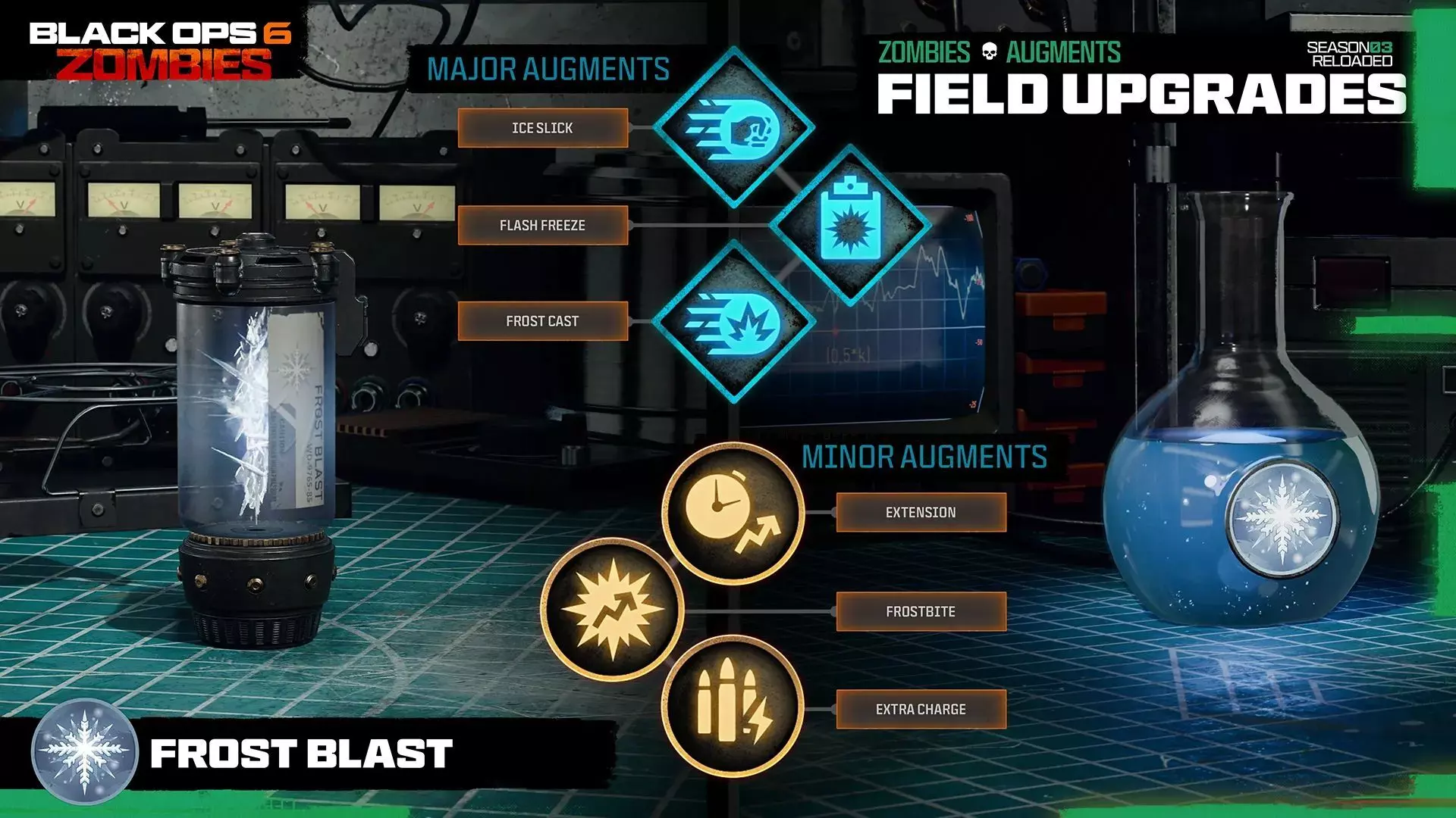 创建一场暴风雪,激活时造成致命冰霜伤害,并使进入其中的敌人减速。 此战场升级可在所有五张僵尸地图中使用,与之前可用的战场升级一同装备,前提是你在配装中选择了它,或在游戏中通过菜单进行切换。