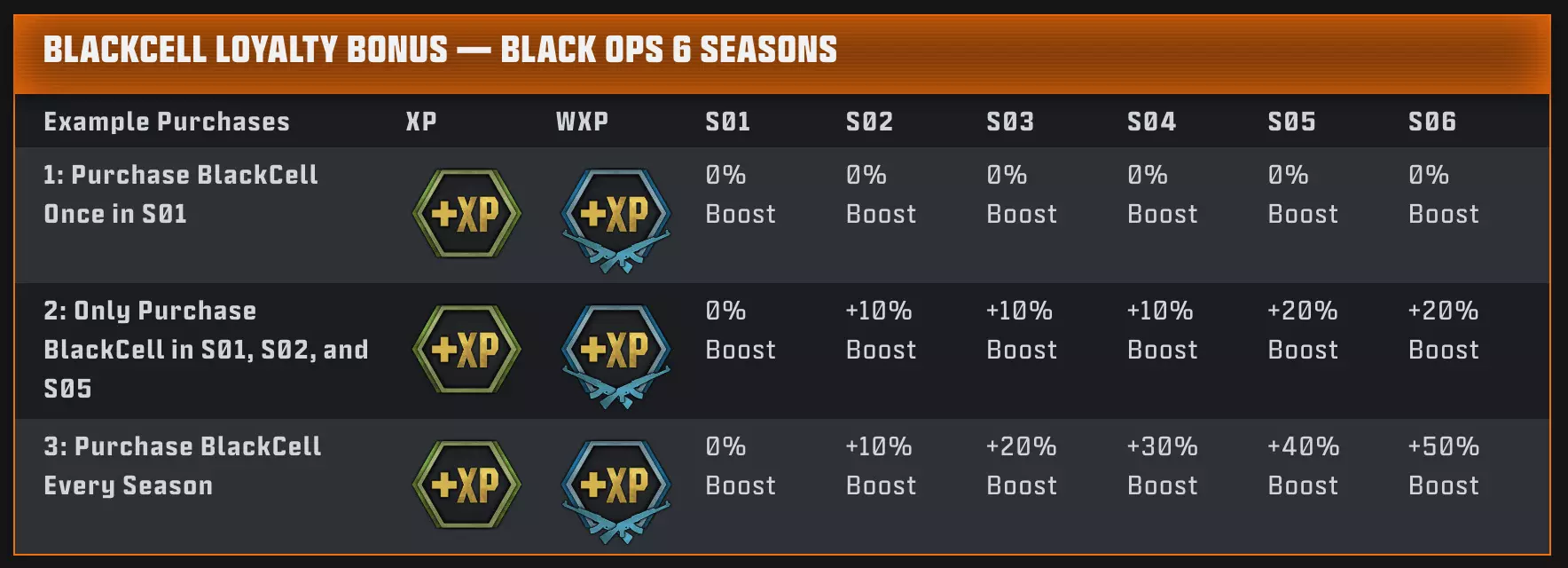 BlackCell忠诚奖励:在《使命召唤:黑色行动6》前一赛季购买过BlackCell的玩家,若继续购买第03赛季BlackCell,将获得永久10%的玩家及武器经验值忠诚奖励;购买过第01赛季和第02赛季BlackCell的玩家可获得最高20%的奖励(在《使命召唤:黑色行动6》每个赛季都购买BlackCell的玩家可获得最高50%的奖励!)