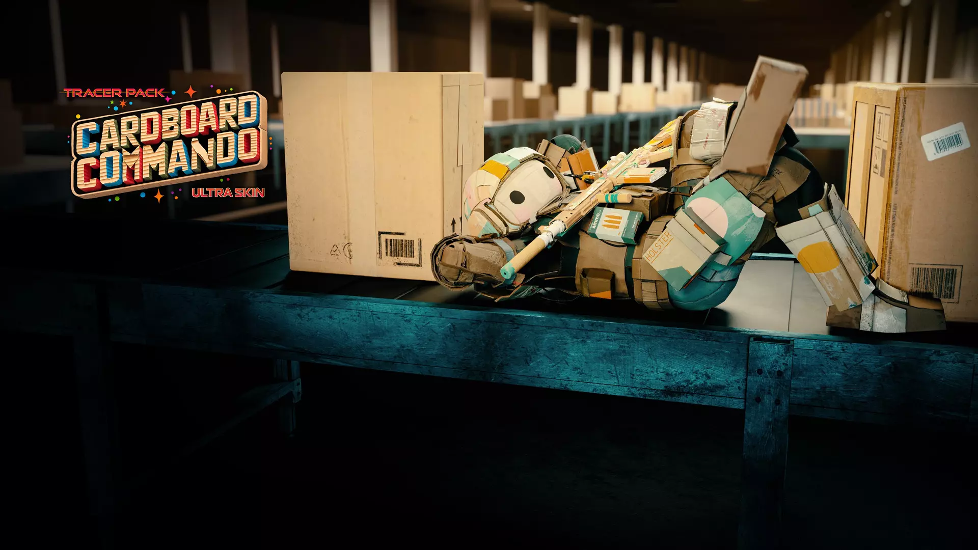 通过两把专为废土环境设计的强力武器蓝图,在强大力量与过热熔化之间维持微妙平衡:【反应过载】LR 7.62狙击步枪,枪身散发着幽然烟雾;以及【贝克勒尔监测器】PP-919冲锋枪。这两把武器均配备蓝绿色与黑色曳光弹及X射线击杀特效。 装备 Toro 的【不朽辐射】操作员皮肤,身着黑色防护服与防毒面具进行部署,并使用【引爆】表情动作称霸赛场。此组合包还包含一个准星、武器挂饰、动态加载界面、徽章和名片。 【曳光弹组合包:纸板突击队员终极皮肤】