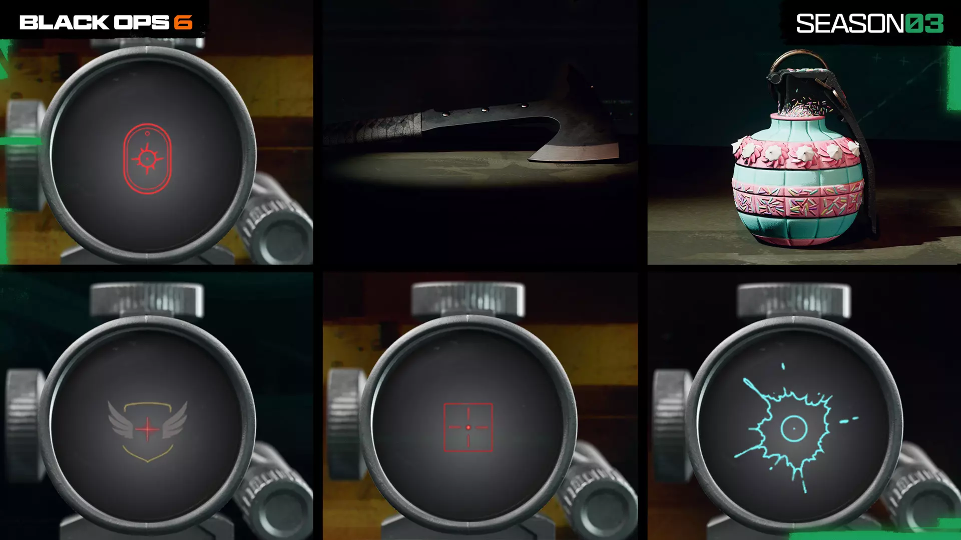 (上文)“翠绿威胁”(动态效果,带有毒绿色弹道轨迹)和“翠绿威胁 黑匣”(动态效果,带有分形金色弹道轨迹和分形金色击杀特效)CR-56 AMAX突击步枪、高价值目标、完成页面。 新装备皮肤和瞄准镜配件 获取战斗斧和破片手榴弹的新装备皮肤,以及四个独特的瞄准镜准星。