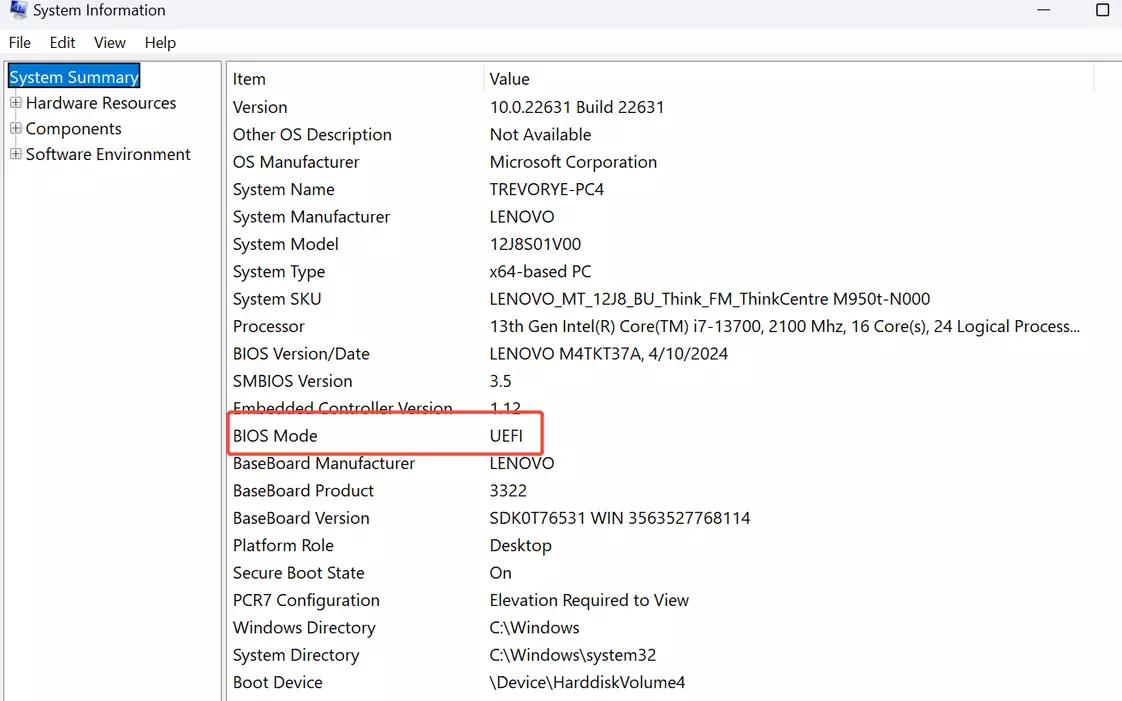 第二步:完成上一步后,将显示“系统信息”页面。检查你的“BIOS模式”是否为“UEFI”。 如果你的BIOS模式是UEFI,请继续进行第四步的设置。 如果你的BIOS模式是非UEFI(例如“传统模式”),则需要先将其切换为“UEFI”模式。你可以联系主板制造商获取进一步支持。