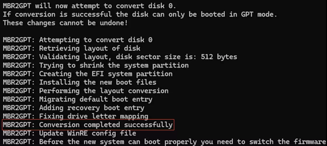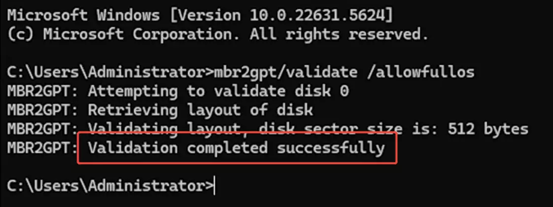 第二步:在弹出的窗口中,复制并粘贴引号内的内容:【mbr2gpt /validate /allowfullos】,然后按回车键。如果显示“成功”消息,你可以继续下一步。如果失败,请重试。