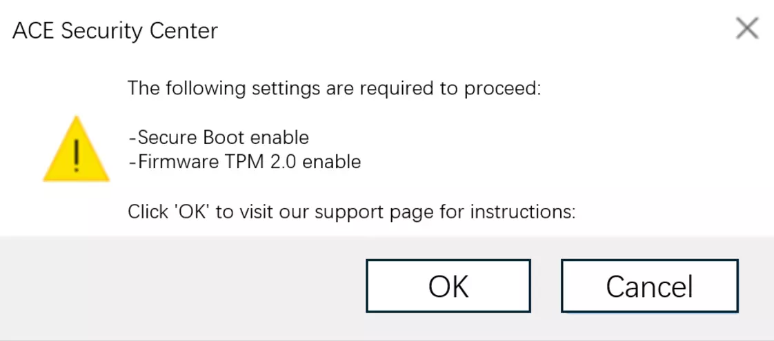 最近,有部分玩家反馈在游戏中看到要求启用“安全启动”和“TPM”的弹窗(如下图所示)。这是Windows 10和Windows 11的安全功能,用于确保电脑在启动过程中仅加载受信任的软件。启用这些功能不会侵犯您的隐私,也不会影响您的电脑使用方式。 安全启动可让游戏检测并清除恶意内容,减少作弊行为,更好地保护您的游戏体验和账号安全。