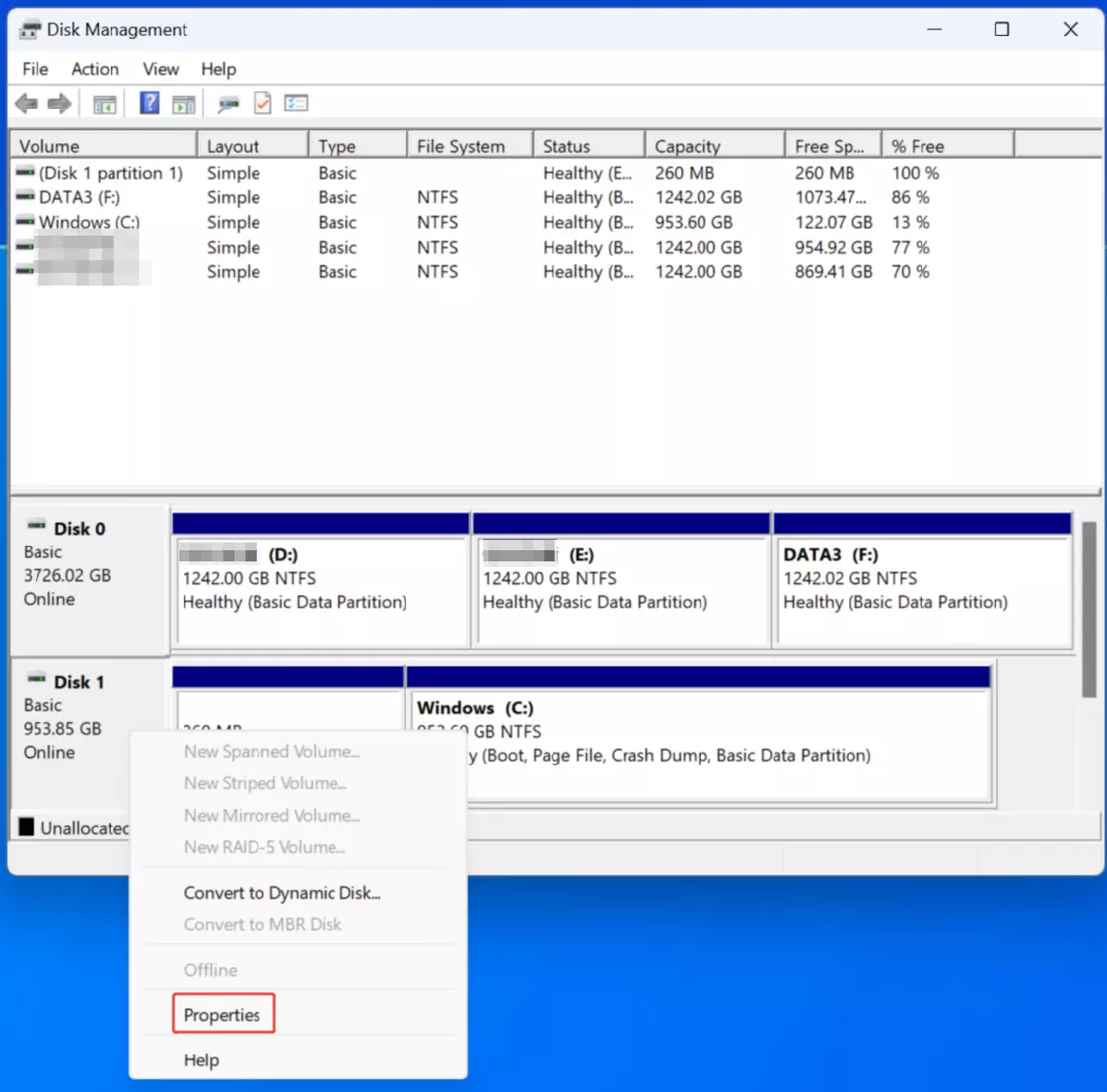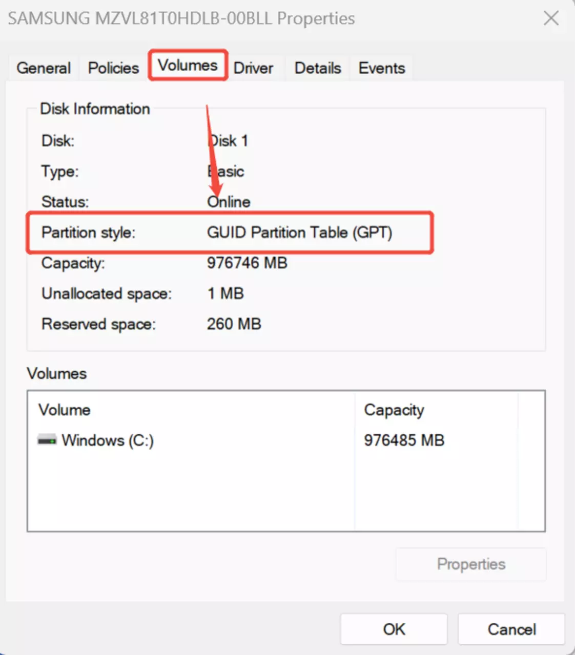 第二步:记住你的磁盘编号(在本示例中为磁盘1)。右键点击对应的磁盘,选择【属性】,在弹出的窗口中点击【卷】,然后查看【分区样式】。