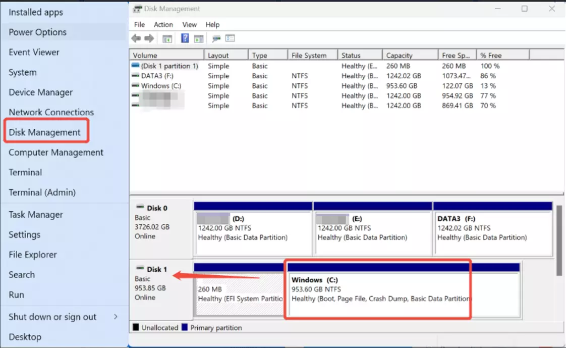 步骤1:检查磁盘是否为GPT格式 第一步:同时按住“Windows”键和“X”键,然后从弹出菜单中选择“磁盘管理”。选择后,“磁盘管理”页面将会打开。找到你的【系统驱动器】所在的磁盘。(在此图中,C盘位于“磁盘1”)