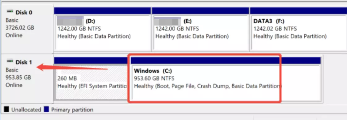 第三步:如果你只有一个磁盘,请跳过此步骤。如果你有多个磁盘,确定上一步中哪个磁盘编号包含你的系统驱动器。以下图为例,C盘位于磁盘1中。记住这个磁盘编号,你将在下一步中需要用到它。