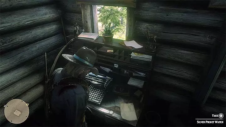 莱尼让亚瑟给他带一件独特的物品——银怀表。 前往西伊丽莎白地区西部的小木屋。木屋位置如上图所示——地图上大写字母“W”的正上方,草莓镇西北方向,小溪河以南。木屋内有一头灰熊,它会攻击亚瑟。杀死灰熊后,进入木屋。怀表就在打字机旁边(如上图所示)。莱尼会给你一个炸药。