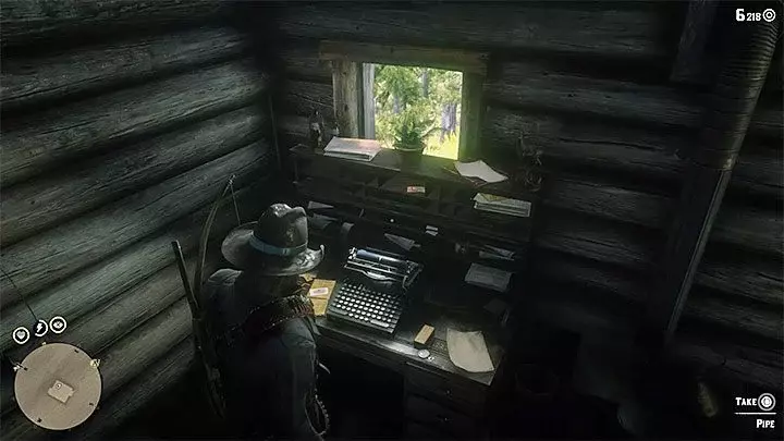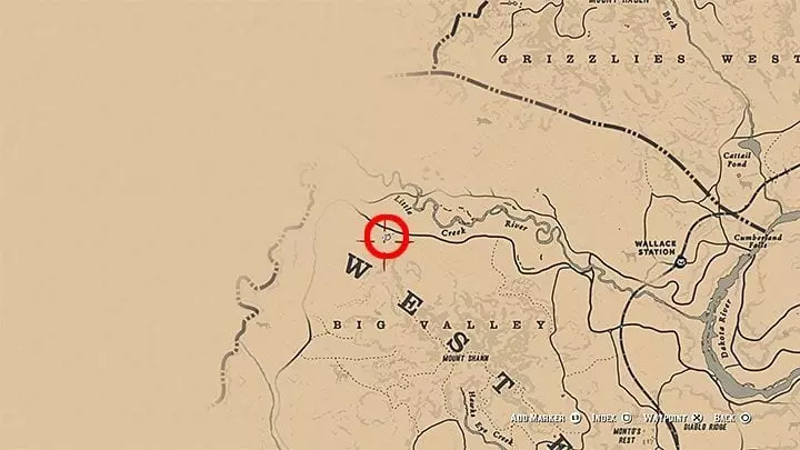 达奇希望你找到一件独特的物品——他丢失的烟斗。前往西伊丽莎白地区西部的小木屋。木屋的位置如上图所示——就在地图上大写字母“W”的正上方,草莓镇的西北方向,小溪河的南方。木屋内有一头灰熊,它会袭击亚瑟。杀死这头熊后,进入木屋。烟斗就在打字机旁边。达奇会给你马刺。