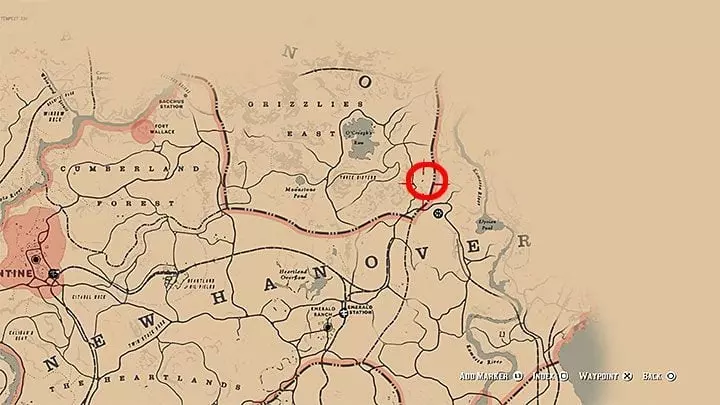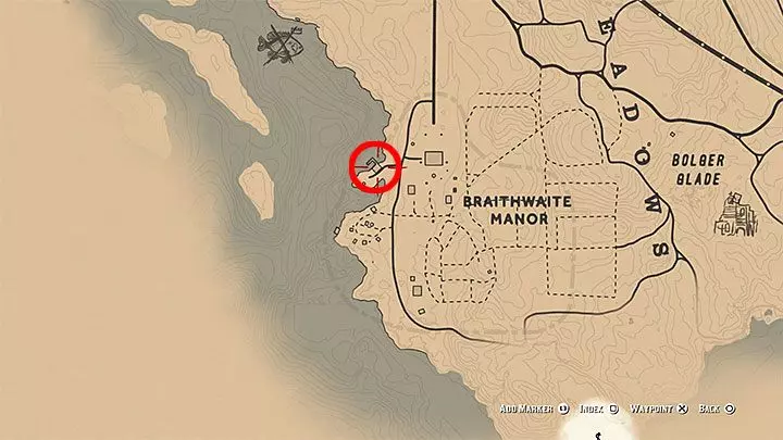 达奇希望你找到一件独特的物品:他丢失的烟斗。前往西伊丽莎白地区西部的小木屋。木屋的位置如图所示:就在地图上大写字母“W”的正上方,草莓镇的西北方向,小溪河的南边。木屋内有一只灰熊,它会攻击亚瑟。杀死这只动物。然后你需要进入木屋。烟斗就在打字机旁边。达奇会给你马刺。