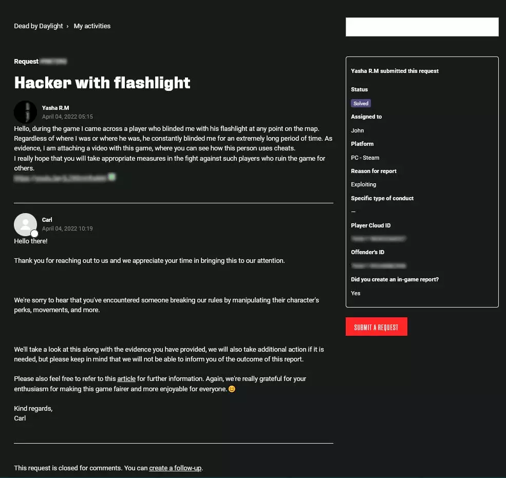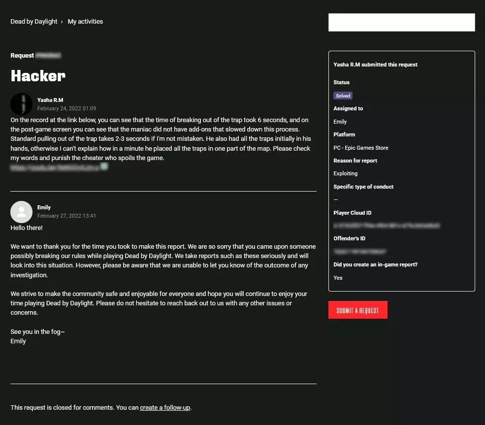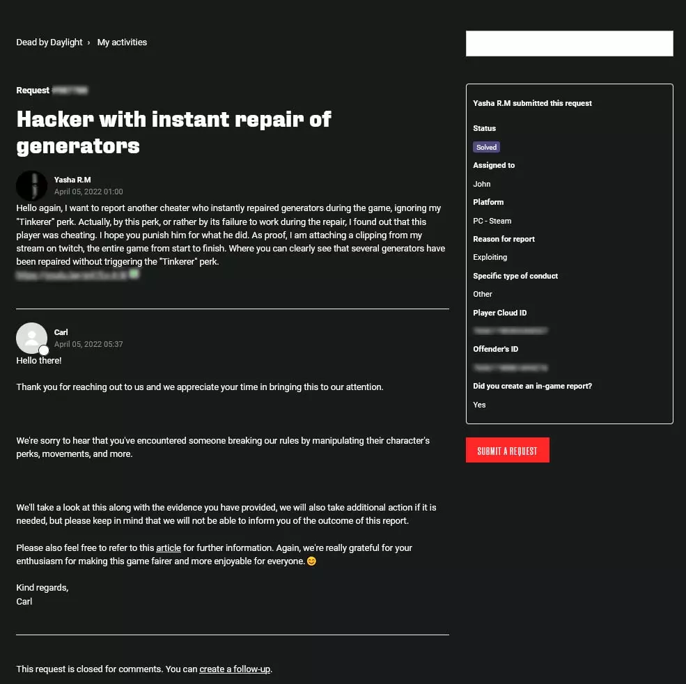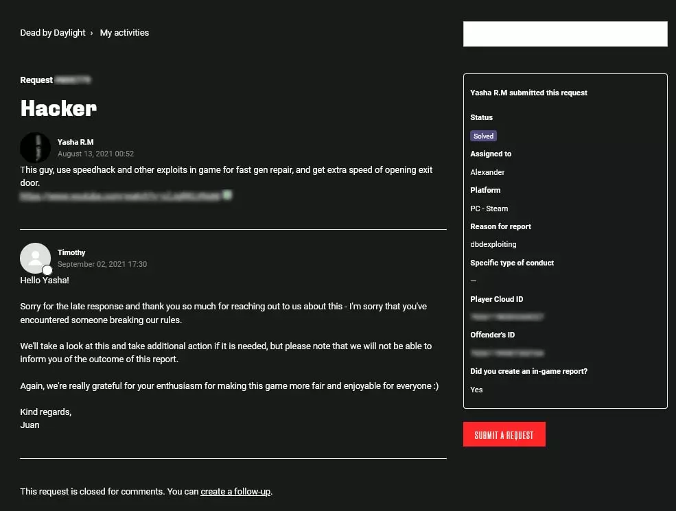 现在我来解释一下每一栏是做什么用的,以便大家清楚需要我们做什么。同样非常重要的是,如果您希望申诉被更快受理,请用英语填写申诉!主题(可选):此处可简要描述玩家所使用的作弊手段,例如“使用加速外挂的作弊者” 问题/举报描述:在此处详细描述具体观察到的情况以及作弊玩家的行为,例如瞬间修理发电机、破坏游戏内的崩塌机制、使用怀旧皮肤但游戏时长仅10小时,或使用其他任何作弊手段。拥有能够证明你所言的证据非常重要,理想情况下是录制下违规行为的视频,可以将其上传到视频平台并设置为链接可访问。 附言:无论如何,我当时提交的正是这类证据,而且完全足够。 平台:在此选择你遇到作弊者时所使用的游戏平台。 举报原因:在此打开下拉菜单,选择“Exploiting”。玩家云ID:在此处填写游戏内的个人ID,可在游戏设置最底部找到。 违规者ID:如果作弊者通过Steam进行游戏,大多数作弊者的Steam个人资料链接会如下图所示。