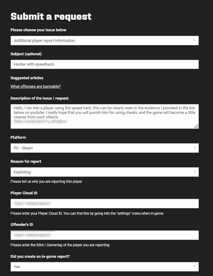 在哪里提交举报? 如果遇到作弊玩家,请前往支持网站。登录支持网站后,会出现一个下拉列表,从中选择“Additional player report information”选项。之后会打开更多用于填写玩家举报内容的字段,请正确填写举报信息。