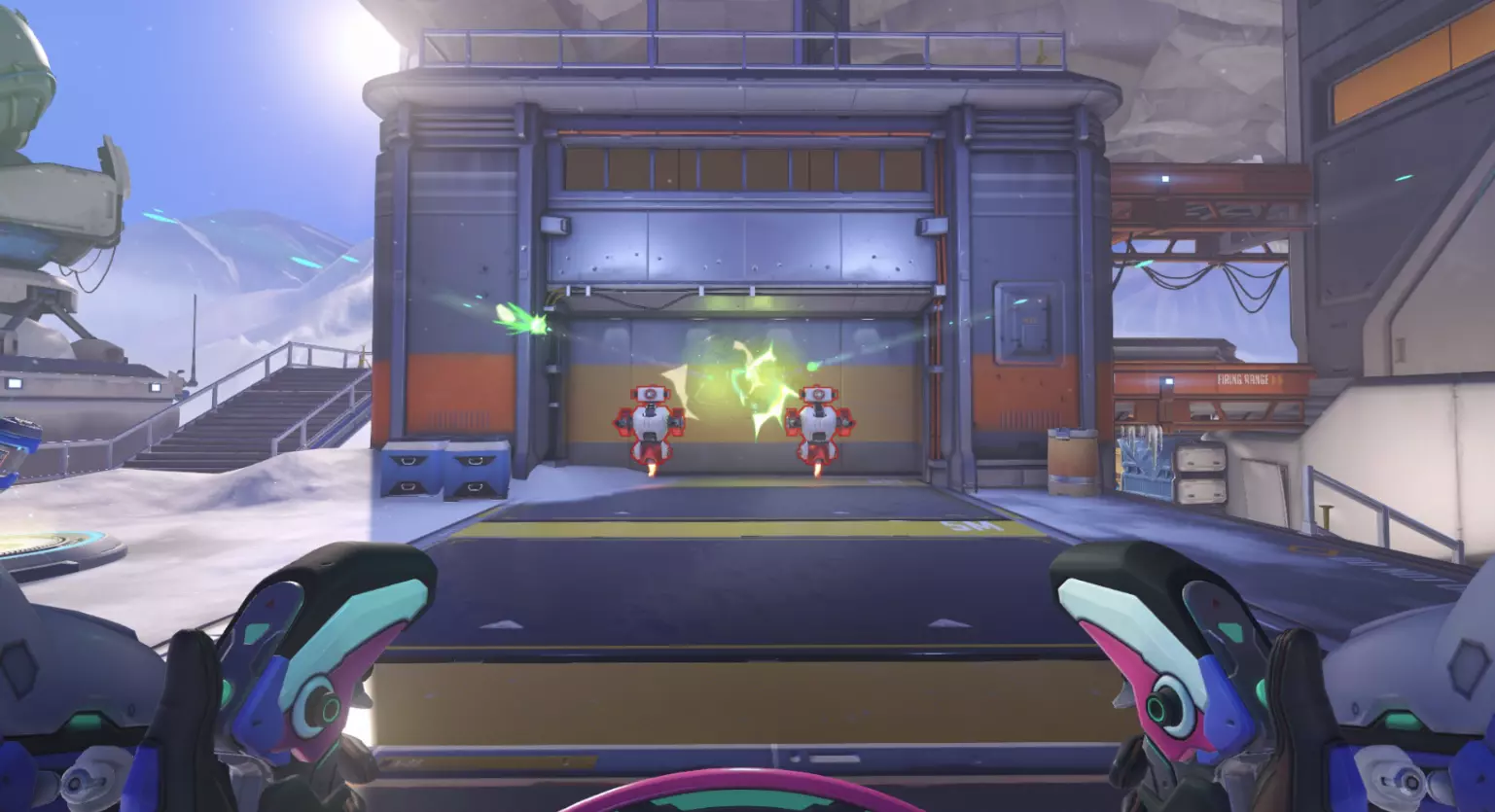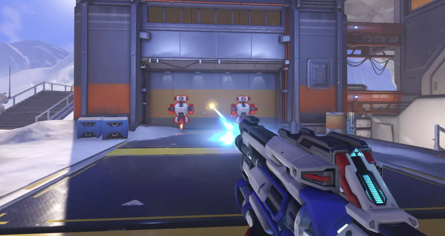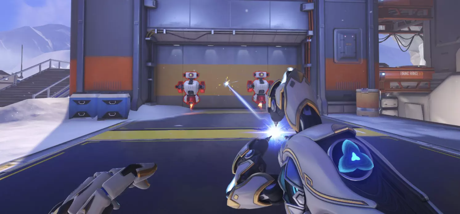 肃清模式在该模式的独特地图以及部分控制点模式地图上进行。每回合前会组建队伍,任务为消灭敌人。此模式中英雄无法复活,因此消灭是永久性的。若长时间未能消灭敌人,地图中心会激活一个迫使双方队伍交战的物体。占领目标点后,队伍即可获胜,但消灭所有敌人会提前结束战斗并获胜。胜利回合结束后,该回合使用过的英雄将无法再次选择。回合数量取决于队伍人数。战斗将以6v6、5v5、3v3和1v1(决斗)的形式进行。 此外,还有【随机决斗】模式,在该模式中,系统会随机为玩家选择英雄,玩家将使用该英雄与另一名同样使用该英雄的玩家进行对战。总的来说,把它叫做“镜像对决”甚至会更合理。 可以训练的地方 我想有些人会希望提升自己的射击技能或瞄准能力。此前,只能在“自己的游戏”中练习射击,但在训练场更新后,那里新增了训练机器人,而且重要的是还添加了射击场。让我们从一些简单的、本质上不那么复杂的内容开始。 训练场地开始 在你面前有两个训练机器人、AI控制的玩家,以及一个跳板和一个增益道具,后者可以立即充满你的超级能力和天赋条。 原则上,这是对英雄造成伤害能力的快速测试。你可以将AI控制的玩家切换为任何已有的英雄。这主要是为了大致了解哪个英雄更容易或更难被击败。
