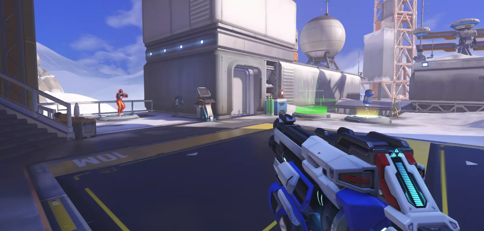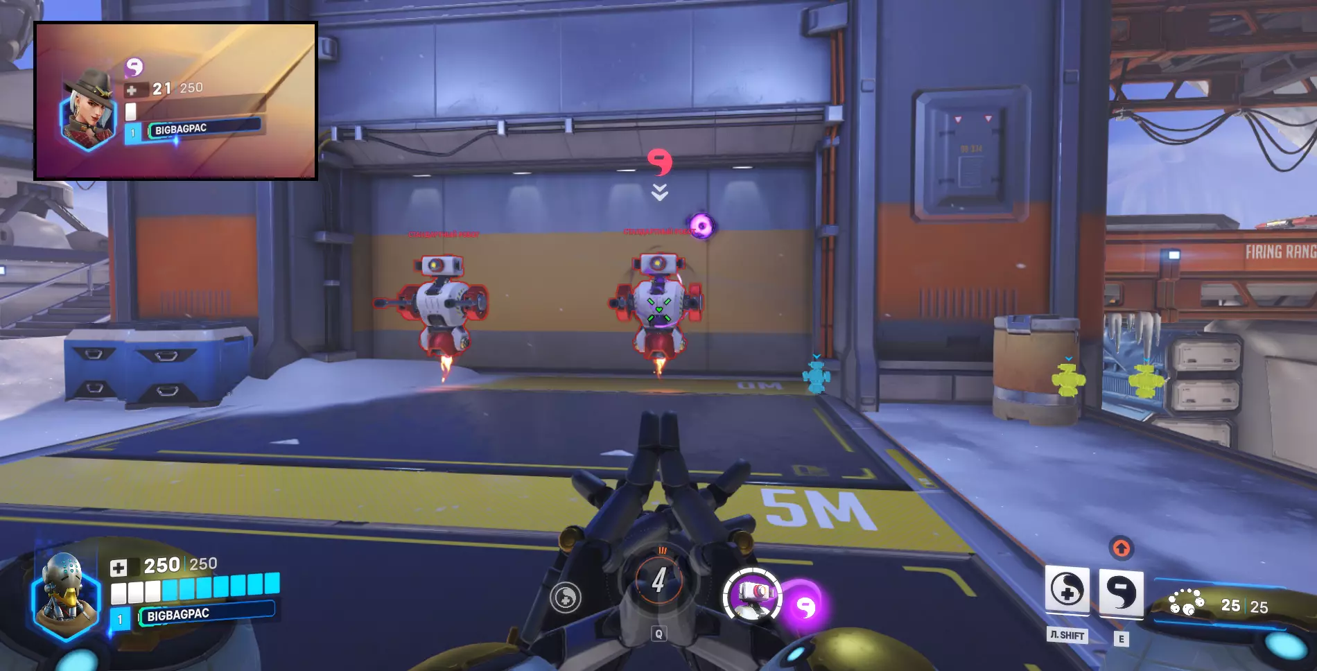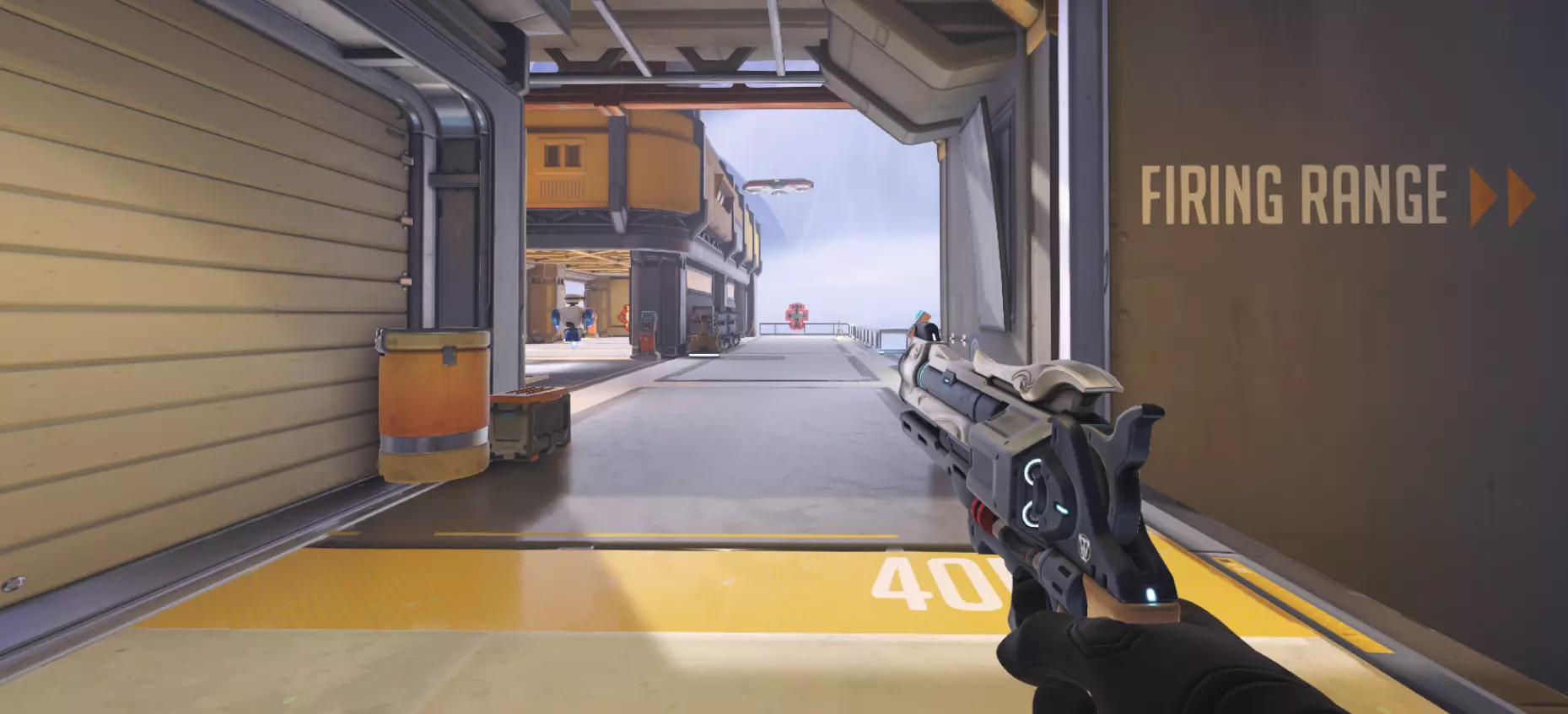 肃清模式在该模式的独特地图以及部分控制点模式地图上进行。每回合前会组建队伍,任务为消灭敌人。此模式中英雄无法复活,因此消灭是永久性的。若长时间未能消灭敌人,地图中心会激活一个迫使双方队伍交战的物体。占领目标点后,队伍即可获胜,但消灭所有敌人会提前结束战斗并获胜。胜利回合结束后,该回合使用过的英雄将无法再次选择。回合数量取决于队伍人数。战斗将以6v6、5v5、3v3和1v1(决斗)的形式进行。 此外,还有【随机决斗】模式,在该模式中,系统会随机为玩家选择英雄,玩家将使用该英雄与另一名同样使用该英雄的玩家进行对战。总的来说,把它叫做“镜像对决”甚至会更合理。 可以训练的地方 我想有些人会希望提升自己的射击技能或瞄准能力。此前,只能在“自己的游戏”中练习射击,但在训练场更新后,那里新增了训练机器人,而且重要的是还添加了射击场。让我们从一些简单的、本质上不那么复杂的内容开始。 训练场地开始 在你面前有两个训练机器人、AI控制的玩家,以及一个跳板和一个增益道具,后者可以立即充满你的超级能力和天赋条。 原则上,这是对英雄造成伤害能力的快速测试。你可以将AI控制的玩家切换为任何已有的英雄。这主要是为了大致了解哪个英雄更容易或更难被击败。