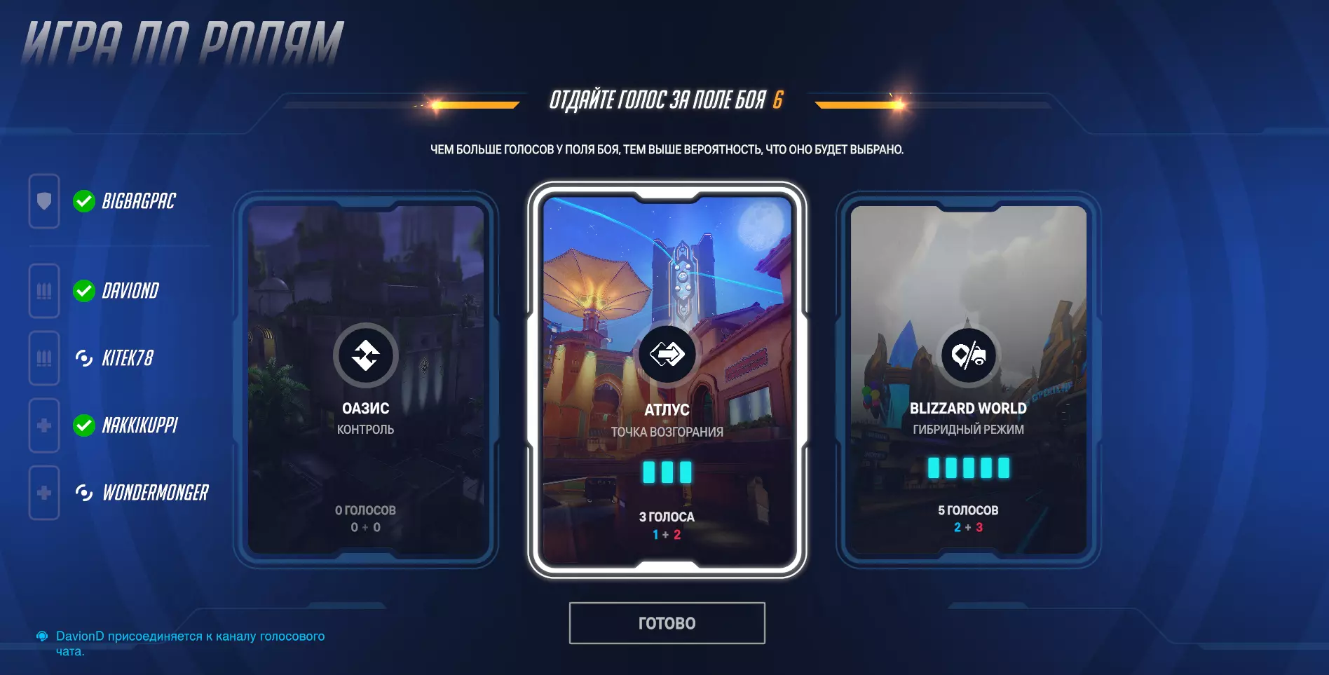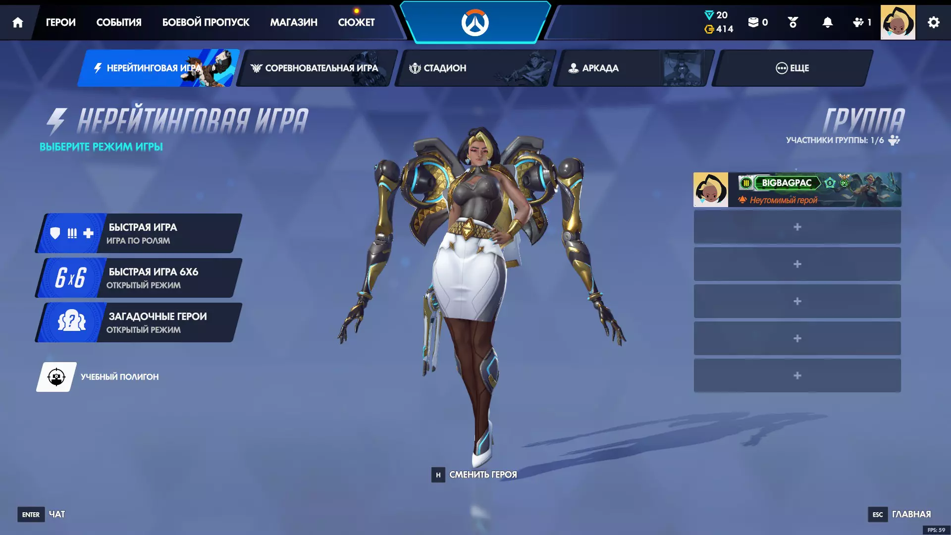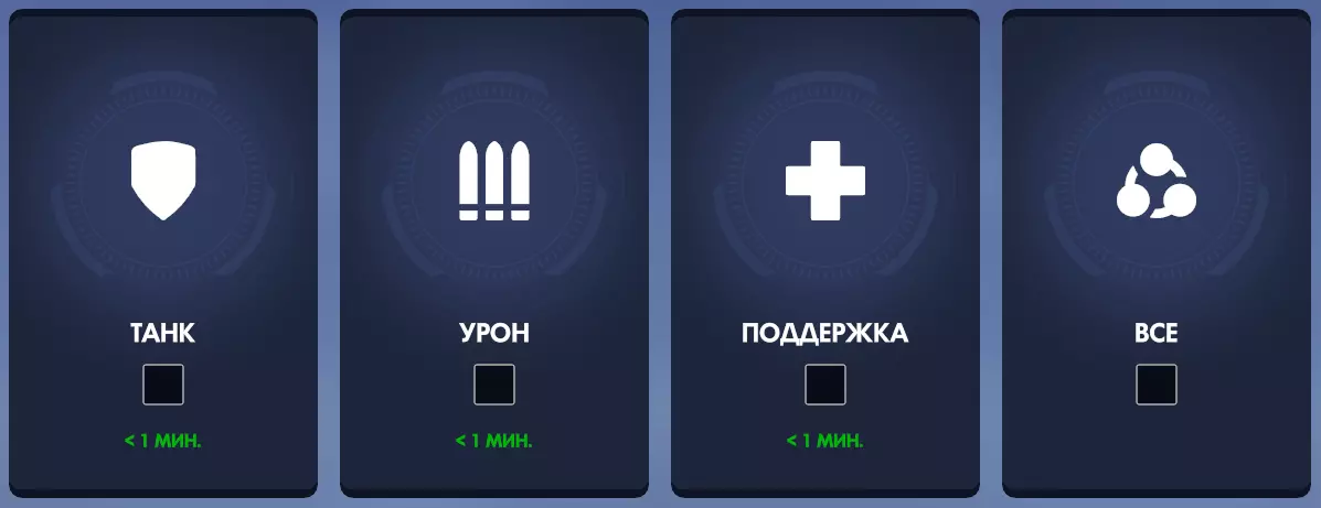 上方 - 您选择游戏模式。 左侧 - 选择角色分组或公开模式。 右侧 - 邀请好友加入队伍。 中间 - 预先选择您要使用的英雄。 在游戏菜单中,您应该已经注意到了不同的游戏类型。主要有4种,其中活跃玩家数量最多。
