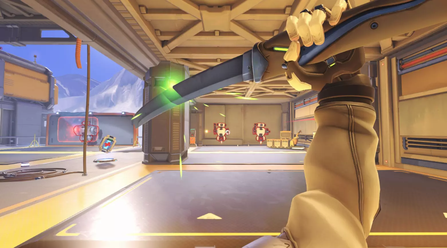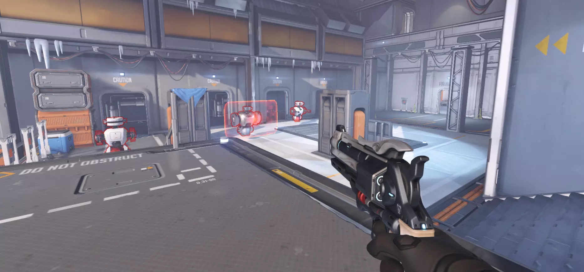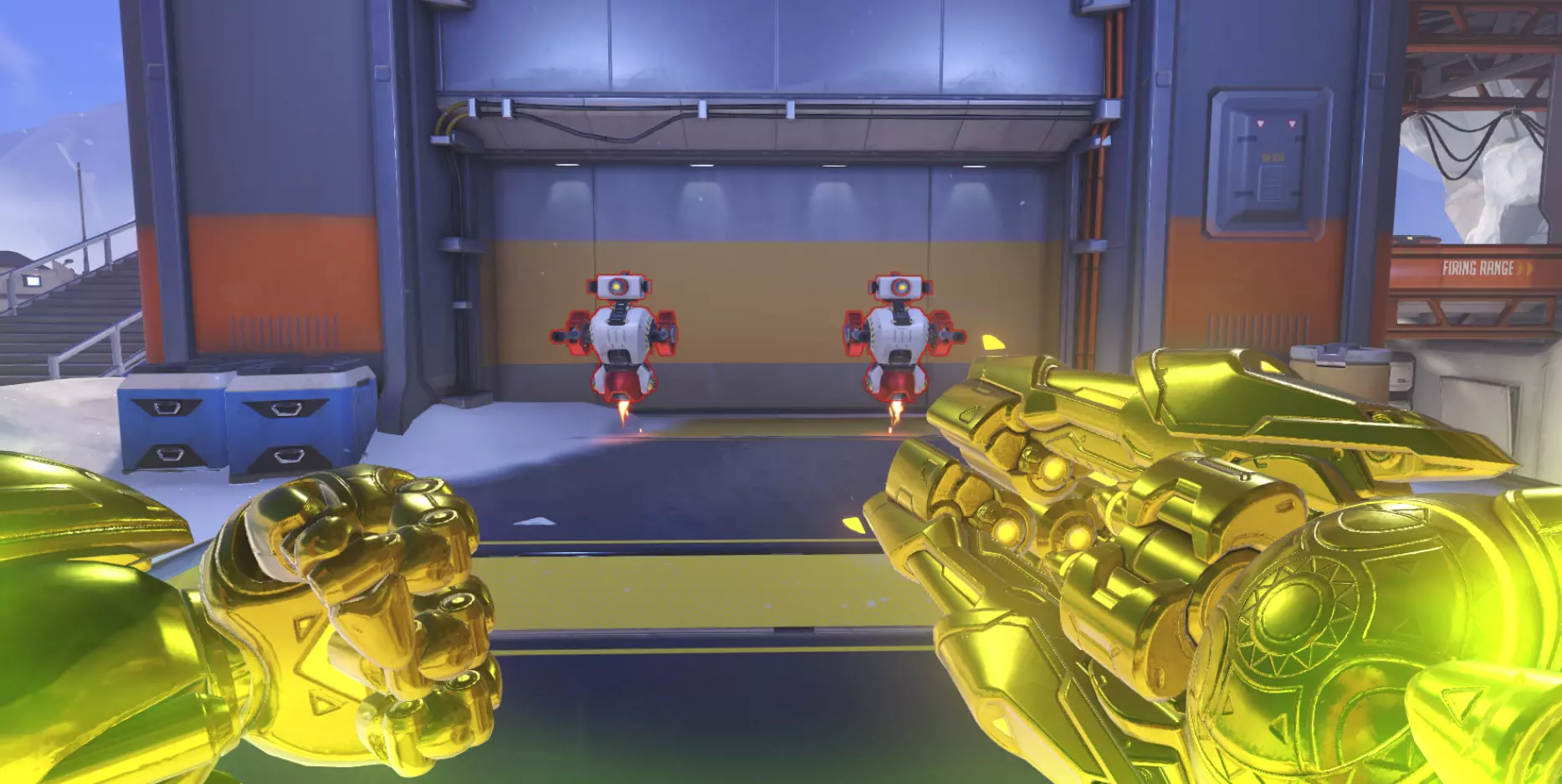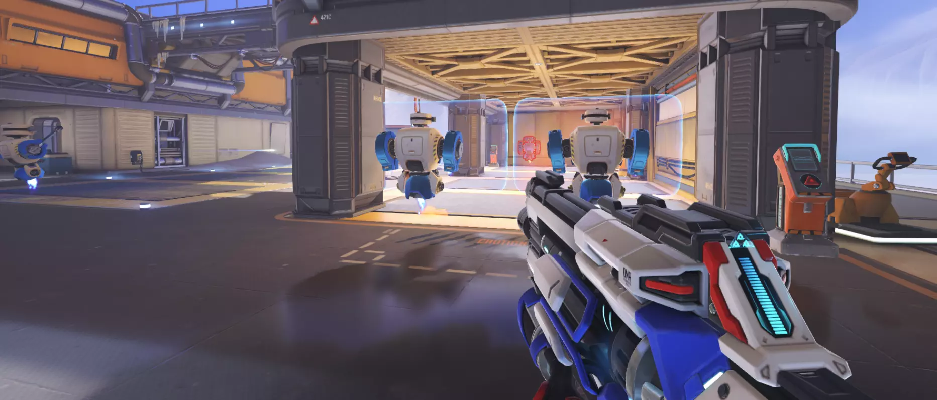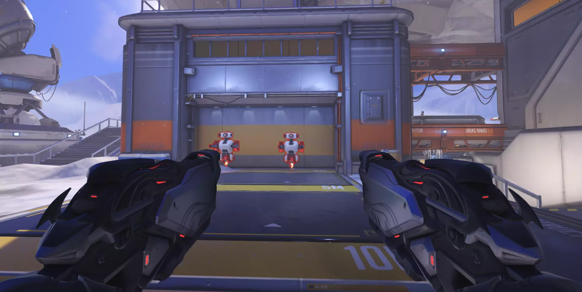 移动中的机器人 这些机器人处于移动状态,你可以对它们进行任意操作。测试你的射击精度、测试伤害、减速机器人,都可以。你还可以将它们切换为几乎总是处于低生命值状态的友军。这些机器人用于训练辅助英雄的武器。