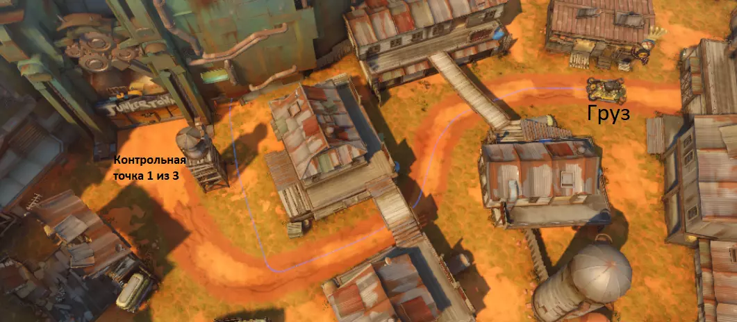 游戏模式:双方队伍分为进攻方和防守方。地图上有一个货物,进攻方需要将其运送到地图的另一端。途中他们会经过多个控制点,当到达控制点后,双方队伍的复活点会随之移动。若进攻方在时间结束前将货物运送到最后一个(第三个)控制点,即可获得胜利。防守方获胜的条件是进攻方未能达成目标。比赛将持续到时间结束。 竞技比赛至少进行2轮,期间双方会在回合间交换攻防位置。这种情况下,将由推动货物距离更远的一方获胜。如果双方都将货物运送至终点,则会进行加时赛。 示例:詹克镇地图的第一个控制点