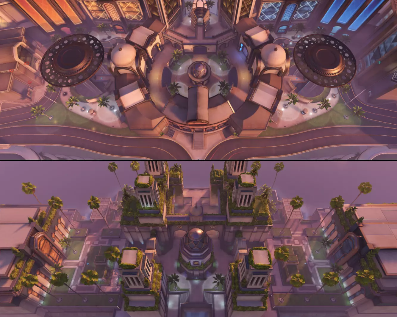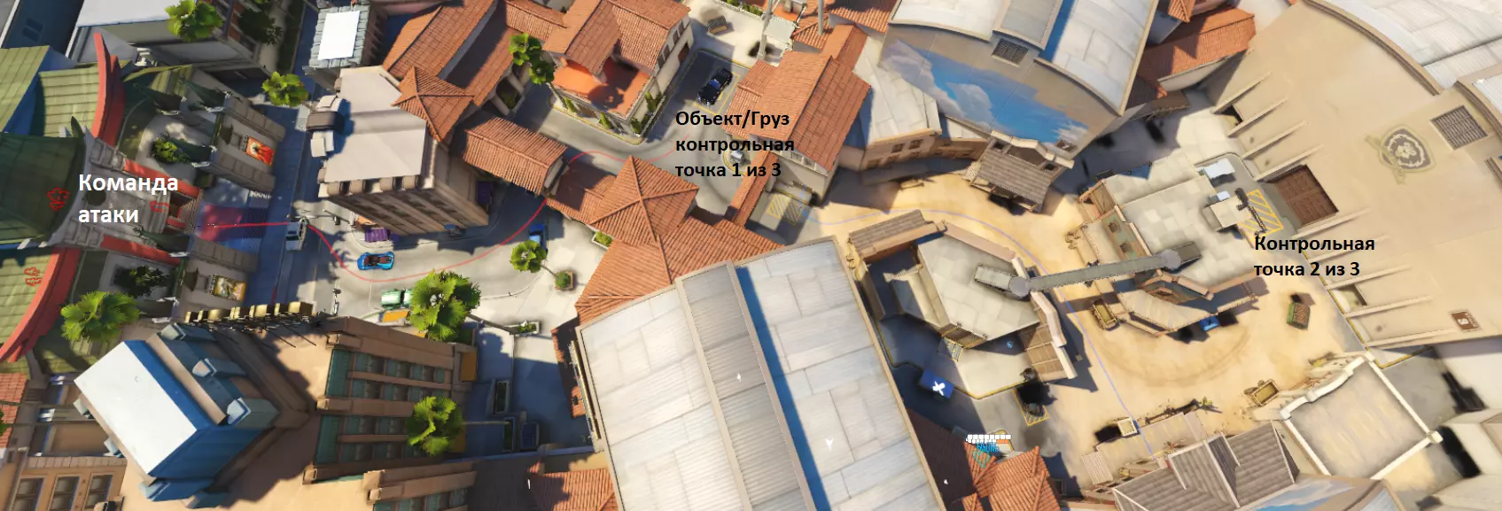 混合模式 - 队伍分为进攻方和防守方。地图上有一个目标点和货物。进攻方必须先占领目标点,然后护送货物到达地图终点。与护送模式不同的是,第一个控制点是目标点,而货物的其余两个控制点之间的距离要远得多。进攻方若能在时间结束前将货物运送到最后一个控制点即可获胜。防守方则在进攻方未能完成上述目标时获胜。比赛将持续至时间结束。 竞技比赛至少进行2轮,期间双方队伍会交换攻防位置。在此情况下,将货物推送得更远或更有效地占领目标的队伍获胜。如果双方队伍都将货物运送至终点,则进行加时赛。如果任何一方队伍都未能至少占领目标区域的三分之一,则判定为平局。在第三和第四回合出现这种情况时,同样判定为平局。 例如——好莱坞地图上的前两个控制点。