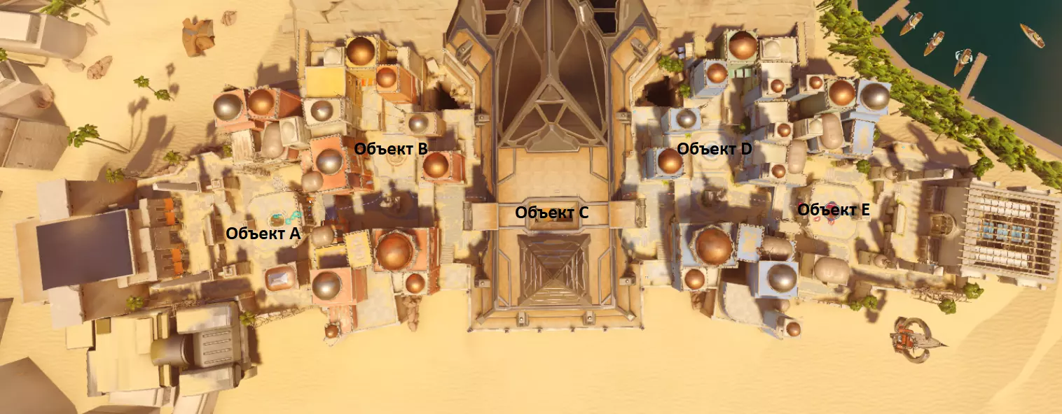 战斗——战斗在一张狭长对称的地图上进行。地图上有5个物体呈一排摆放。地图上同时只能激活一个物体。占领从中央物体开始。占领后,下一个更靠近敌方一侧的物体将被激活。如果敌方队伍占领了物体,就必须开始占领上一个物体。终极目标点的占领时间更长,但可以在无需等待激活时间的情况下被多次占领。率先成功完成5次占领的队伍获胜。比赛将持续至第九次占领。 示例 - 地图【阿努比斯神殿】