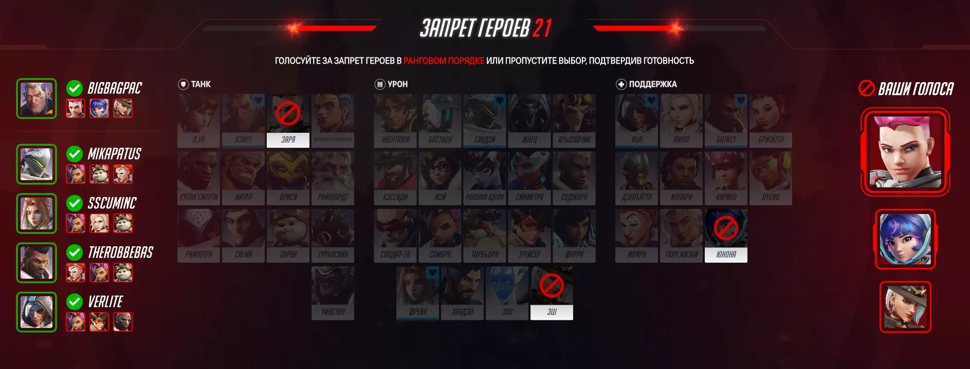 在此模式下,除了投票选择地图外,还有禁用英雄的投票环节,所有比赛参与者都可以投票选出他们不希望在比赛中出现的英雄。该投票在选图之后开始。首先你需要选择心仪的英雄,这样你的队友就会根据你的偏好来禁用英雄,也就是不会投票禁用你喜欢的英雄。接下来您将进行禁用角色的投票。您需要为三名英雄投票,按优先级从高到低排序,即您的第一票将被优先考虑。根据双方队伍的所有投票结果,最终会选出两名禁用英雄,这两名英雄任何一方队伍都不能再选择。