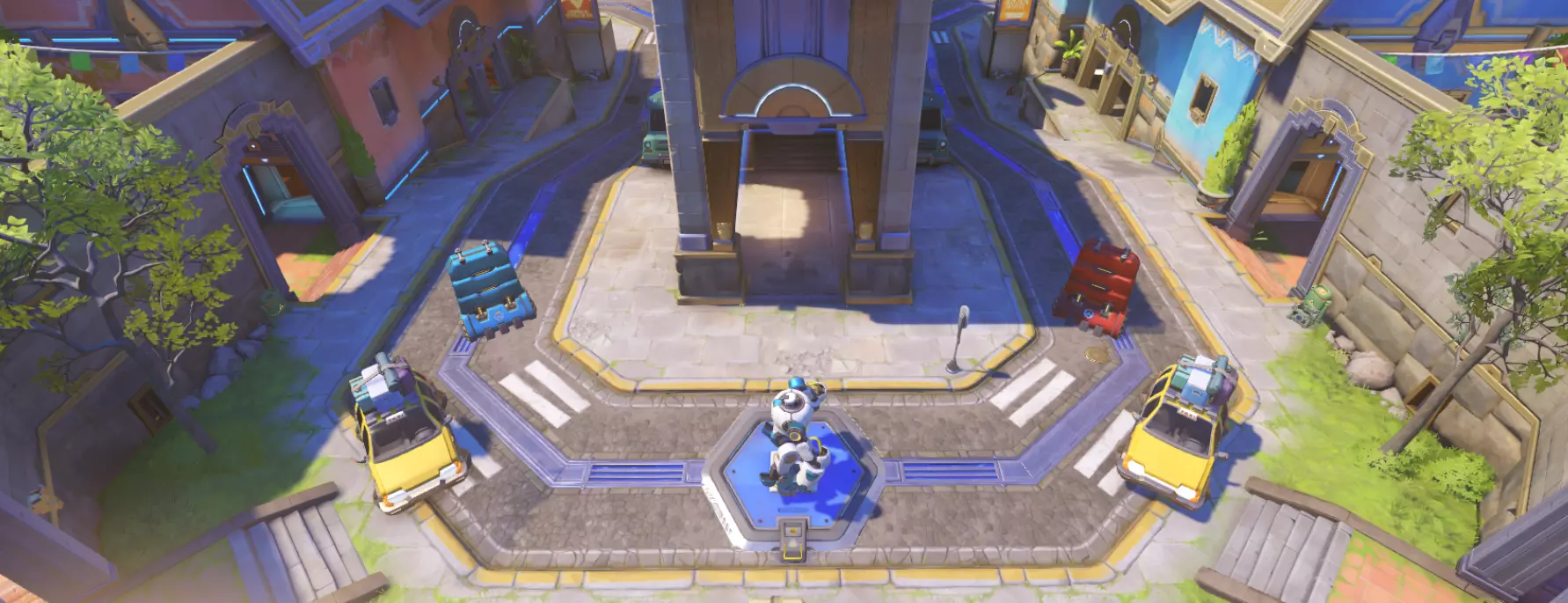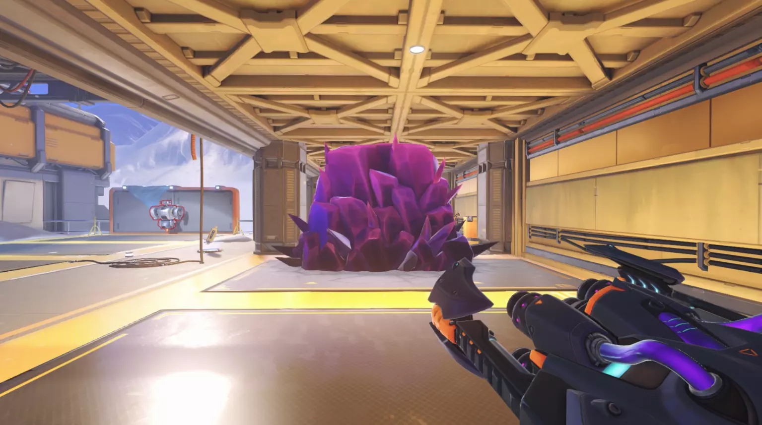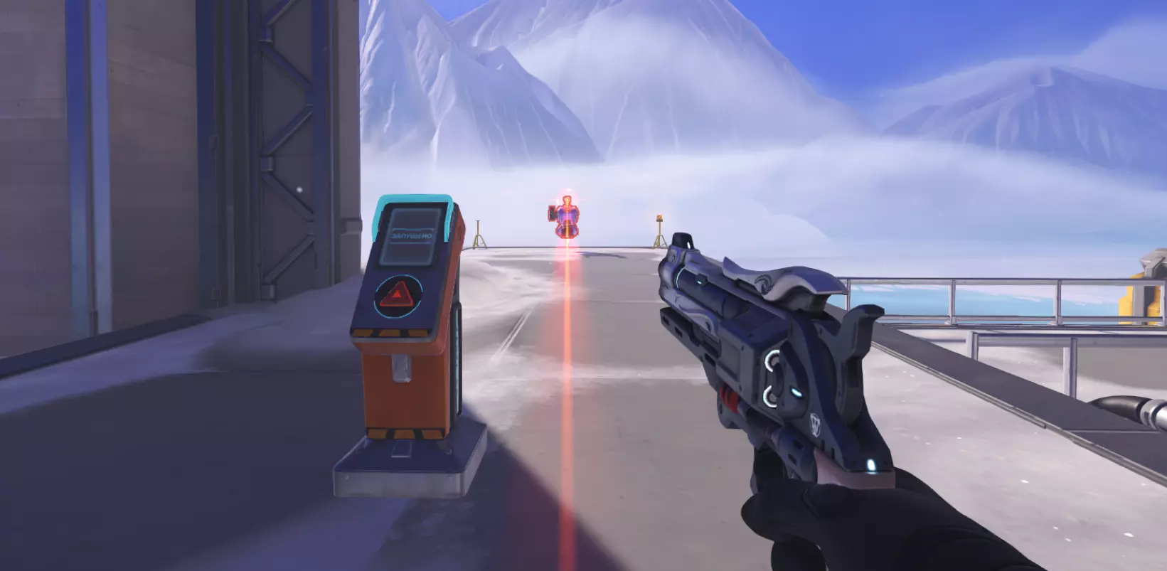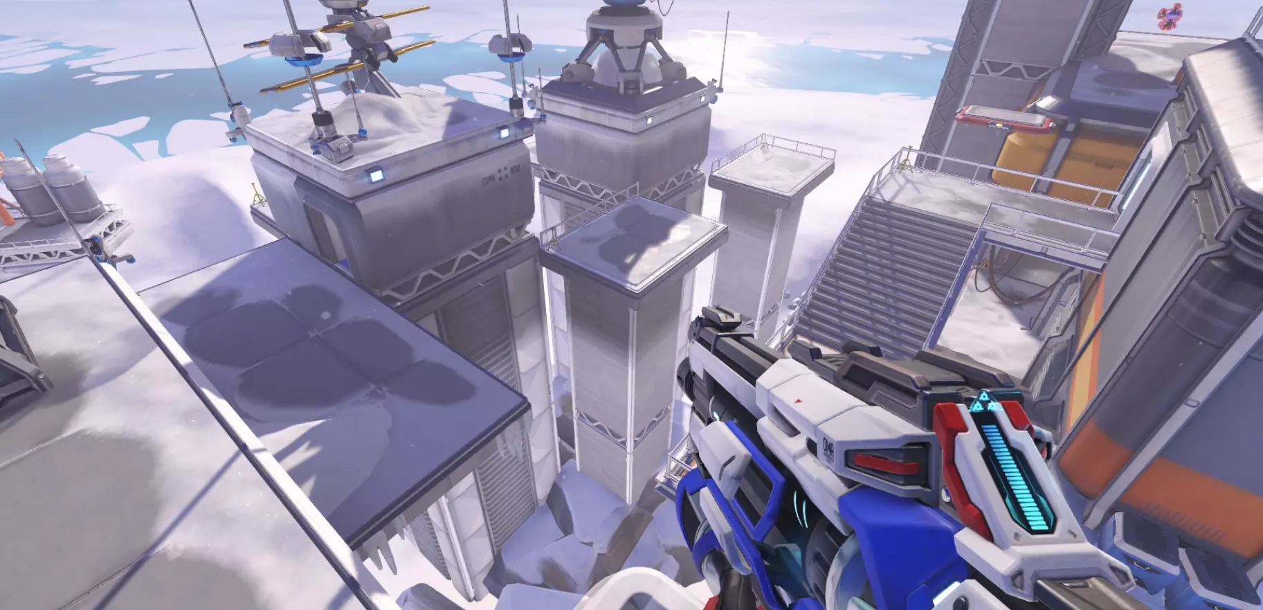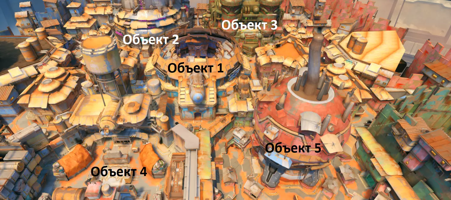 推进战——战斗在一张相当大且开阔的地图上进行。推进战的地图是对称的。地图中央有一个机器人和两个队伍的屏障。队伍需要夺取机器人,让它将己方屏障尽可能推向敌方基地。由于只有一个机器人,且随着时间推移,两个屏障之间的距离会越来越远,因此护送机器人所需的时间也会越来越长。地图上设有控制点,当机器人经过时,控制点会被激活。当达到第一个检查点时,队伍的起始位置会移动。如果敌方将机器人带到中心,队伍位置将返回初始点。机器人将屏障推得更远的队伍获胜。比赛持续到时间结束。本质上,这是双方都参与的护送模式。啊对了,机器人在障碍物之间移动的速度是相同的,而推动障碍物的速度则取决于附近有多少队友,这和其他模式一样。例如——机器人在鲁纳萨皮地图上的初始位置。