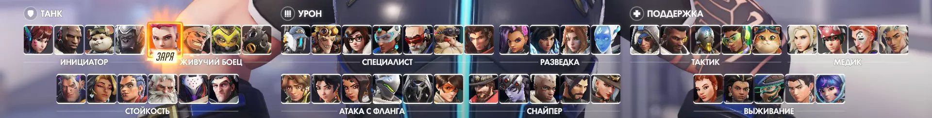 您面前是英雄选择界面。您会发现英雄分为三种角色——坦克、输出和辅助,这些角色又进一步分为子类。每个角色在游戏中都有其特定任务。每个角色下的英雄会根据您使用的语言按字母顺序排列。