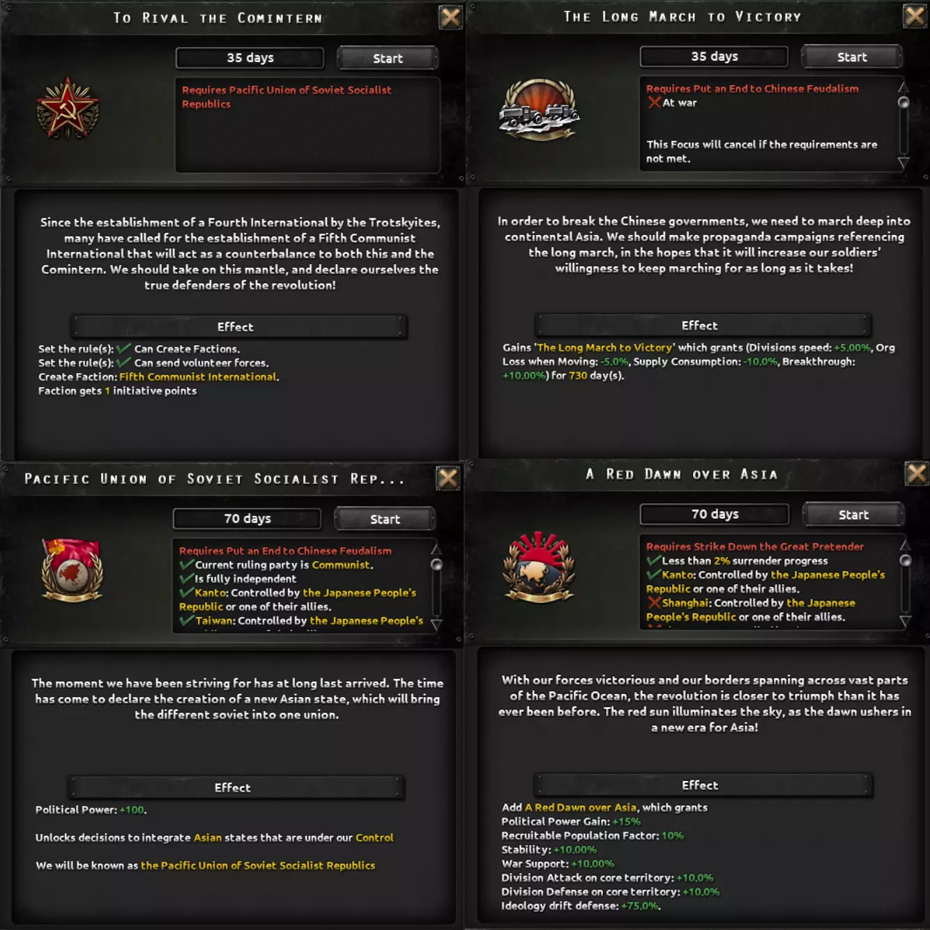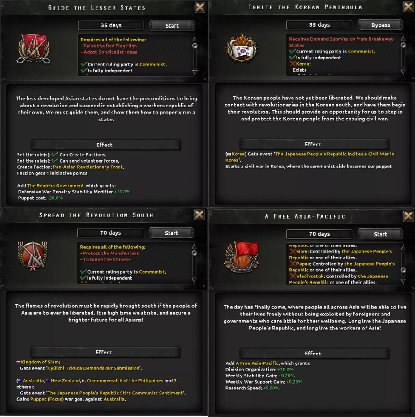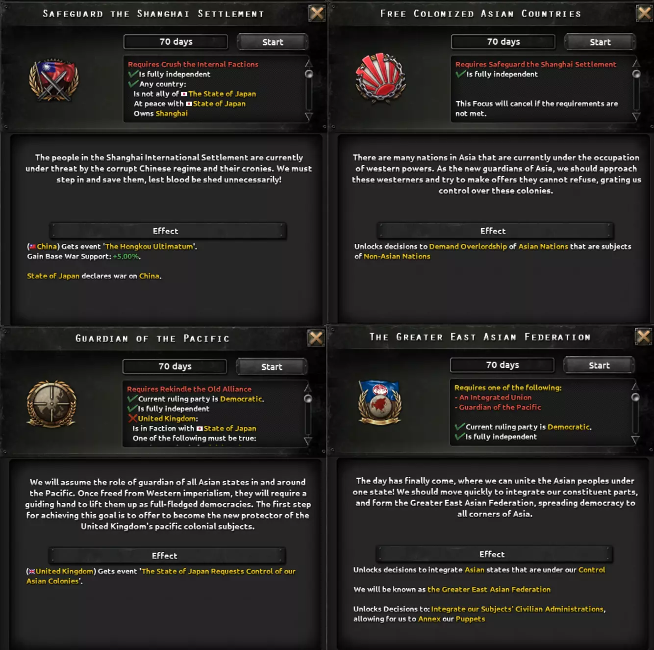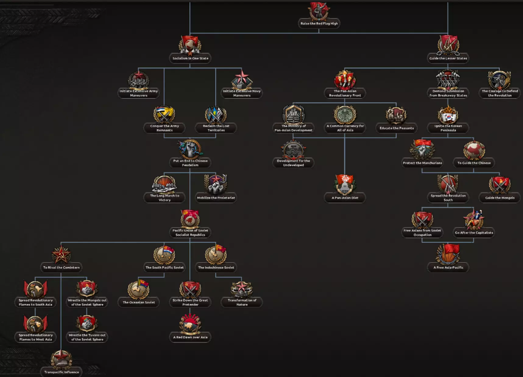 该路线较少涉及傀儡国家,更多侧重于直接占领领土,并最终试图将这些领土更紧密地纳入日本版图。这一点通过吞并满洲以及派系选择得到突出体现,这些选择提供的傀儡加成较少,而更偏向集中化的治理方式。