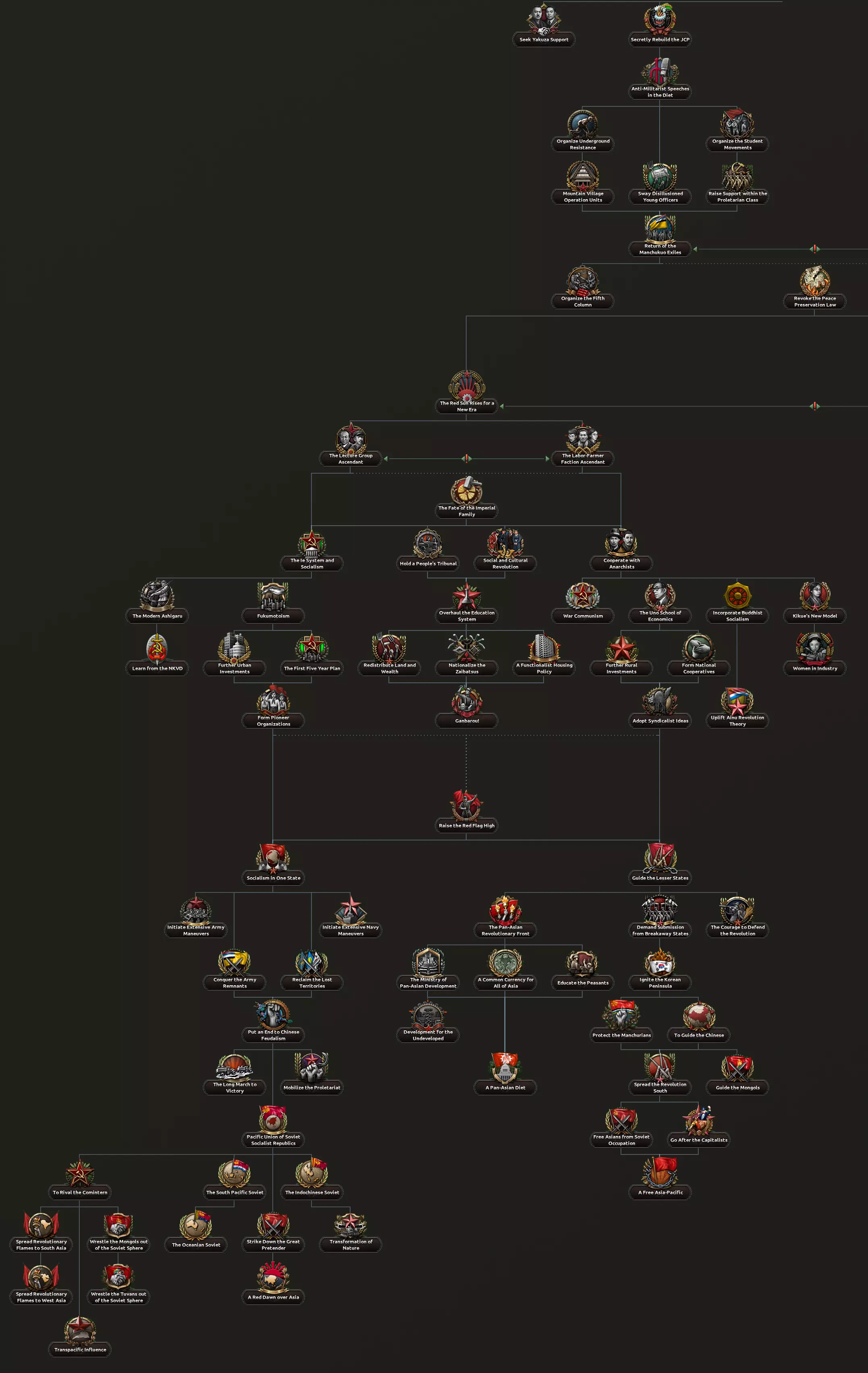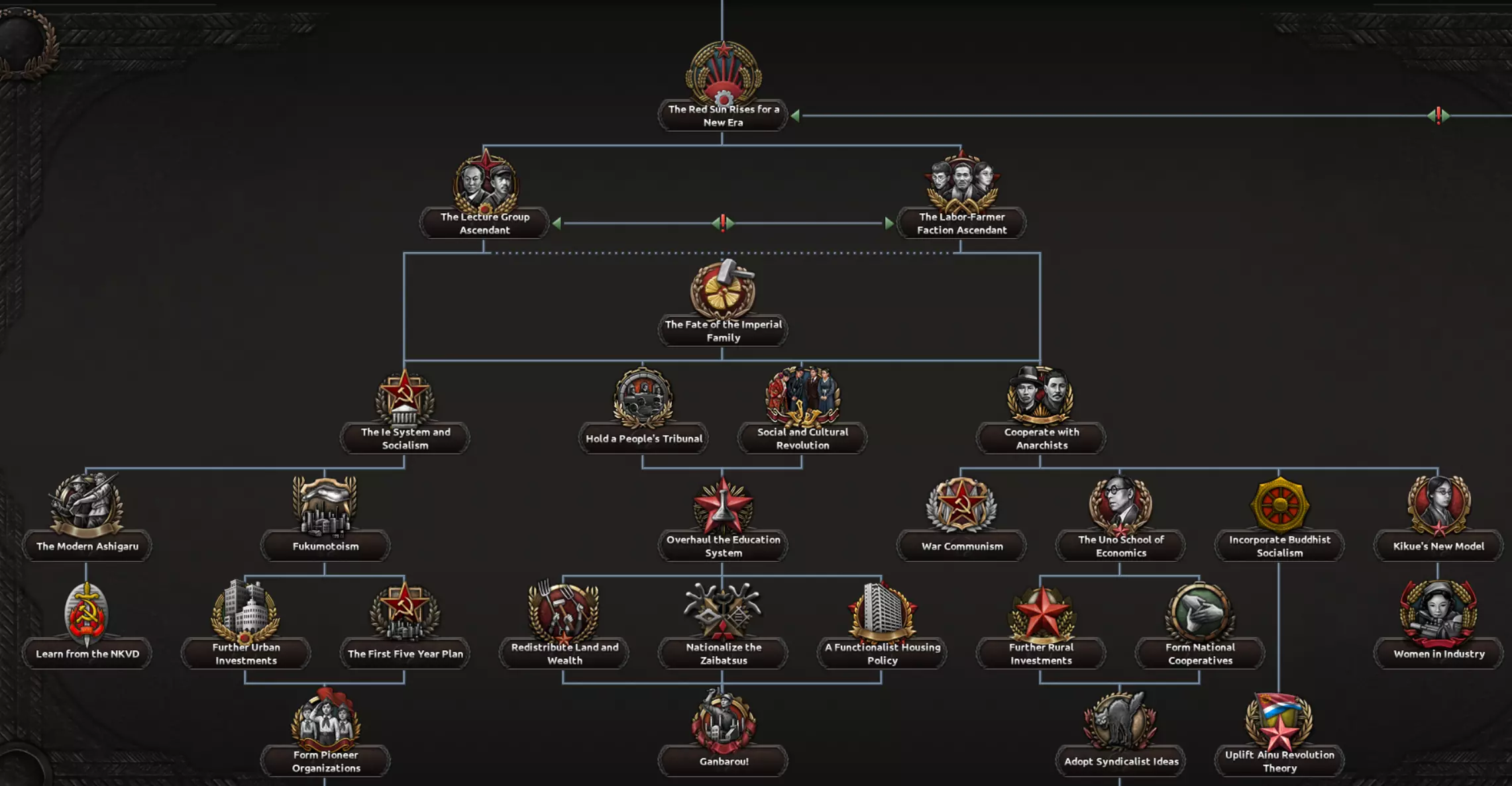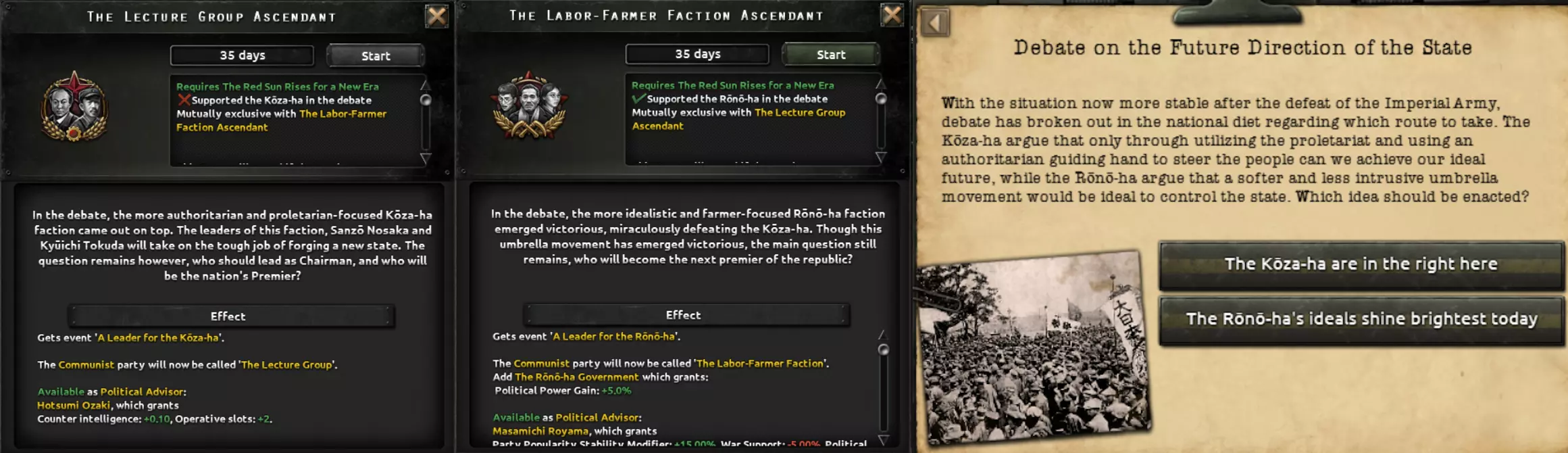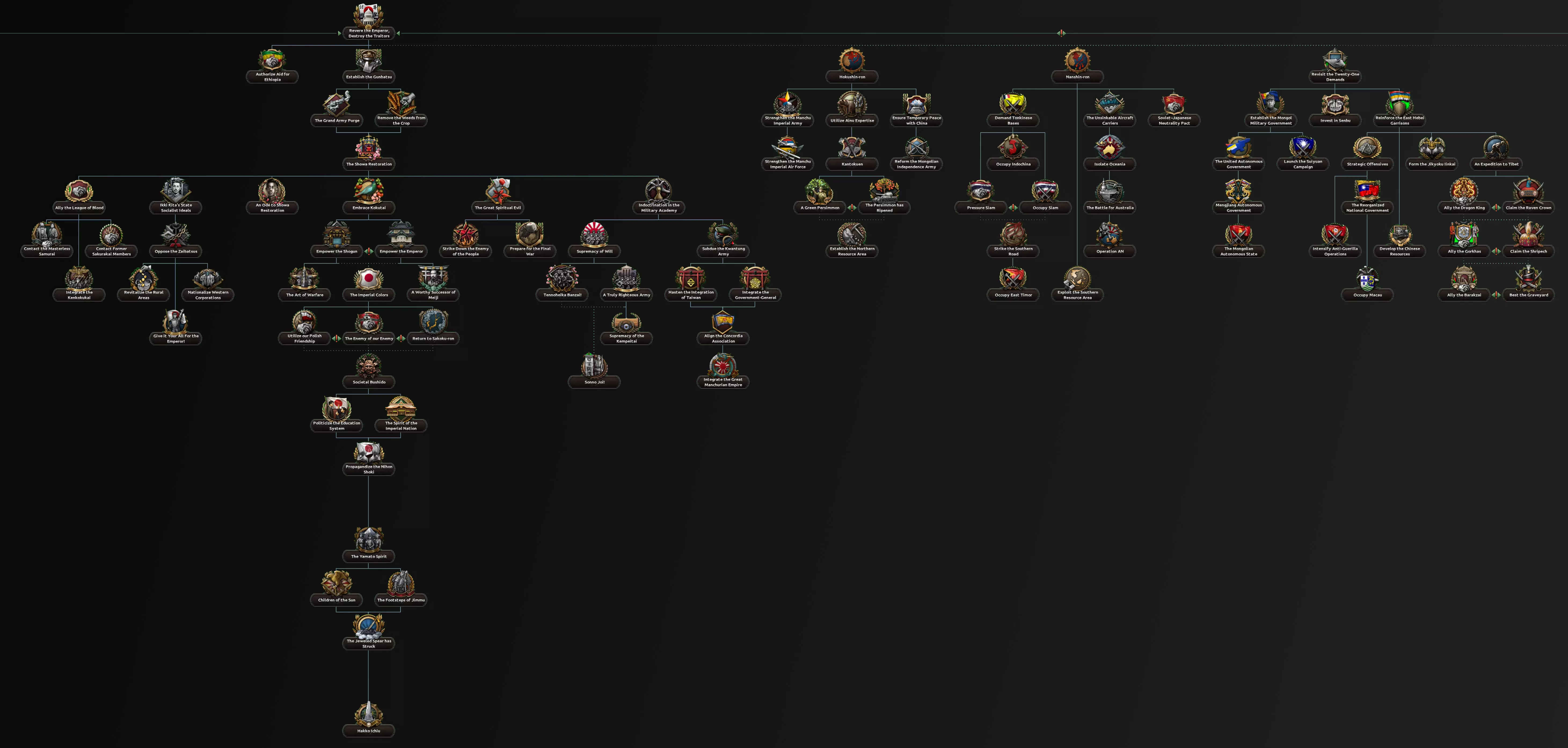 这两条路径都包含一个子分支,涉及对一个深陷帝制与封建制度数百年的社会进行重组。该分支要处理君主制问题、明治时期崛起的寡头势力、投靠军国主义者的叛徒以及落后的教育体系,最终形成以强大工业为核心的发展方向,这将提供足够的追赶动力,以弥补其失去的时间。