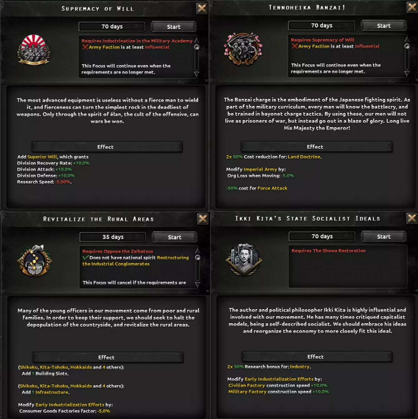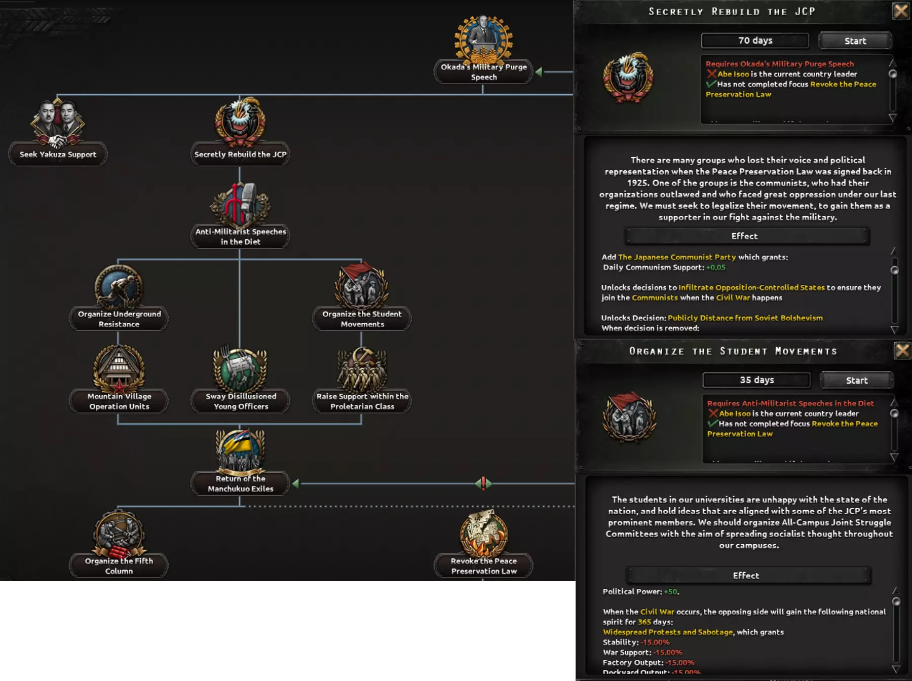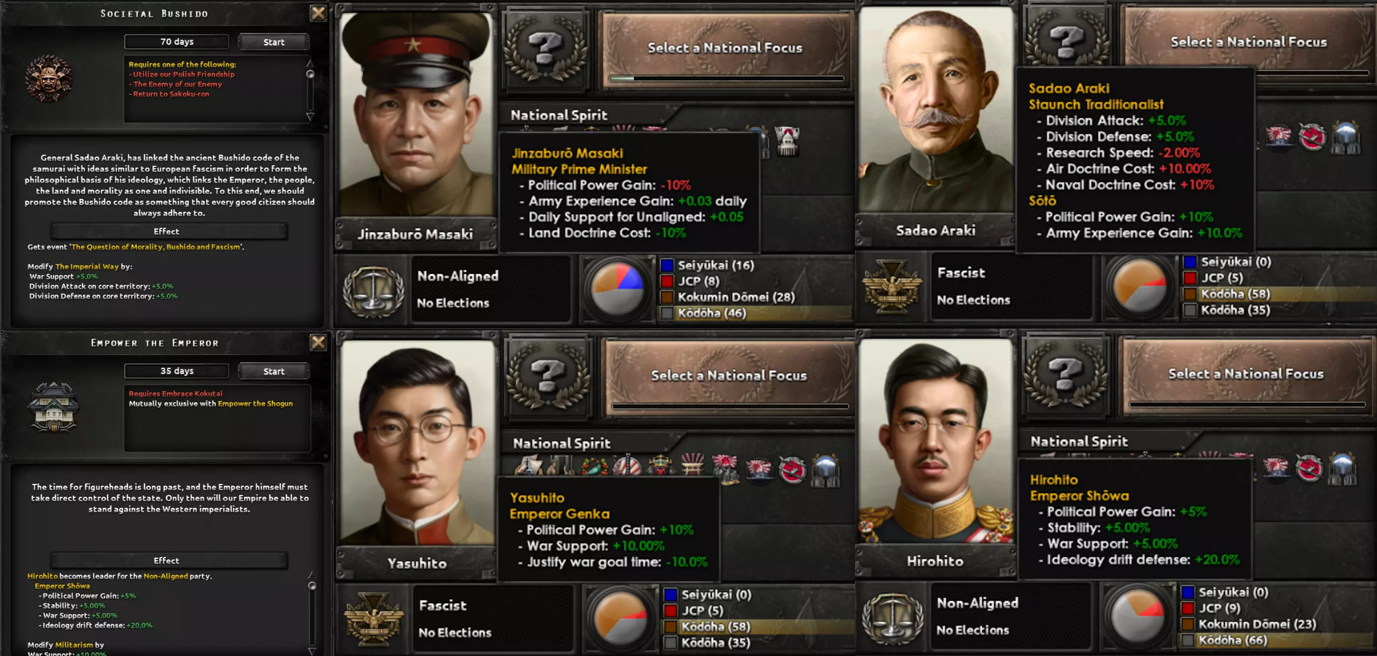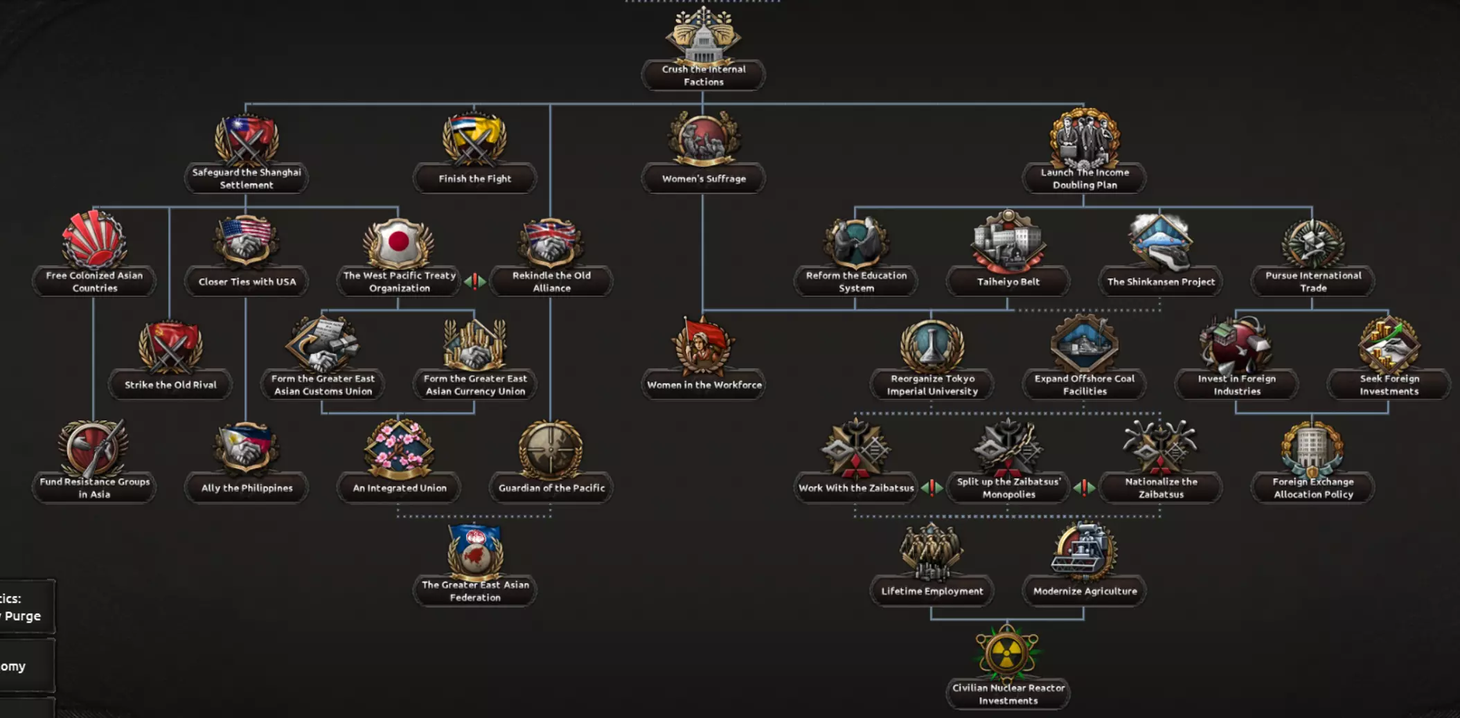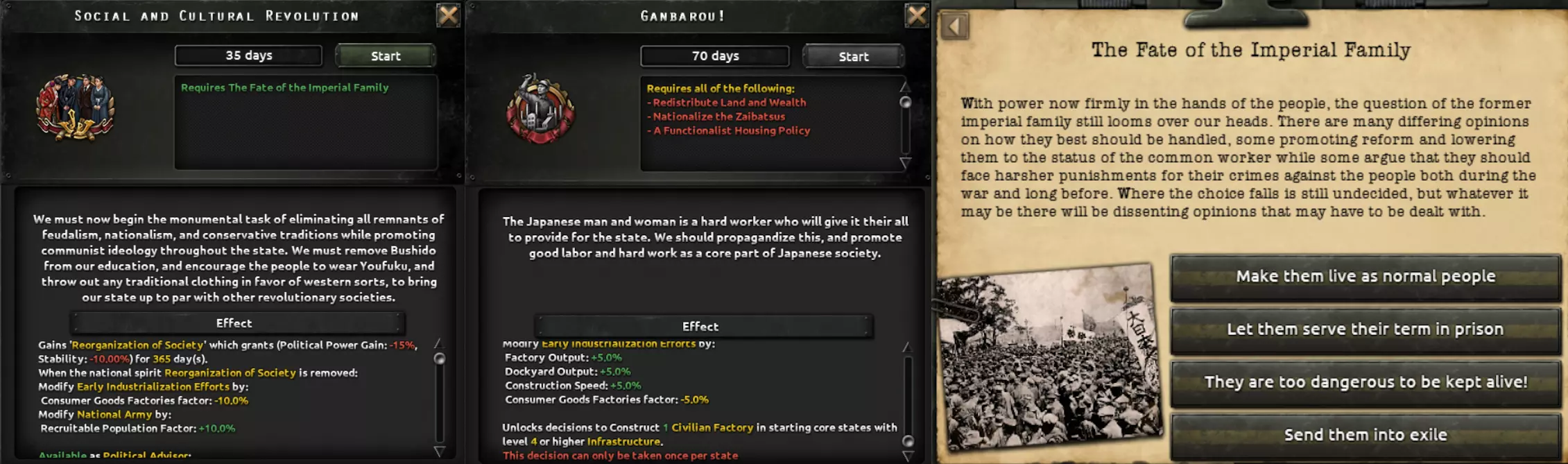 这两条路径都包含一个子分支,涉及对一个深陷帝制与封建制度数百年的社会进行重组。该分支要处理君主制问题、明治时期崛起的寡头势力、投靠军国主义者的叛徒以及落后的教育体系,最终形成以强大工业为核心的发展方向,这将提供足够的追赶动力,以弥补其失去的时间。