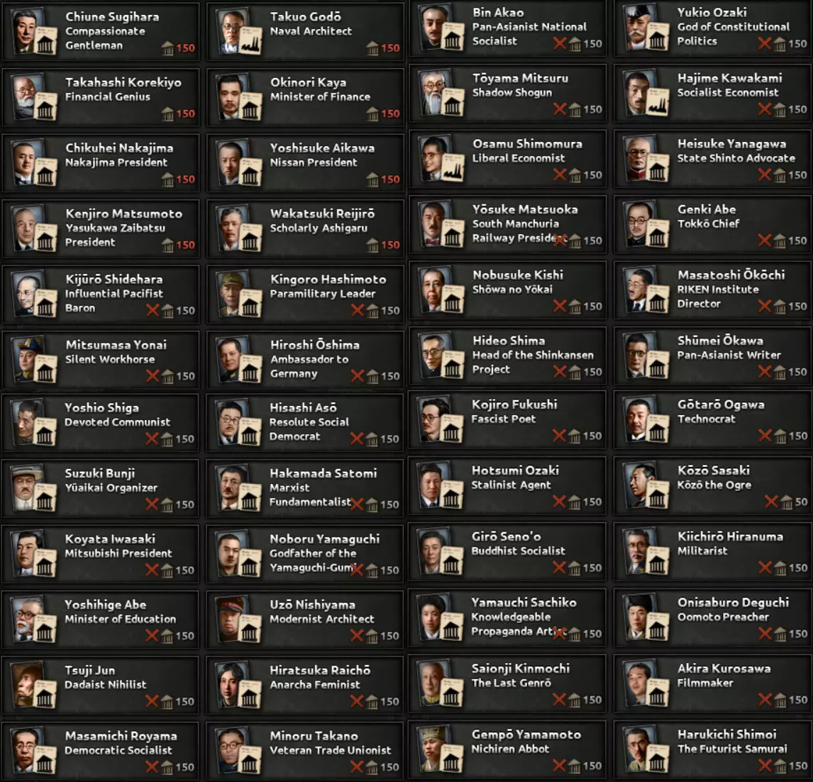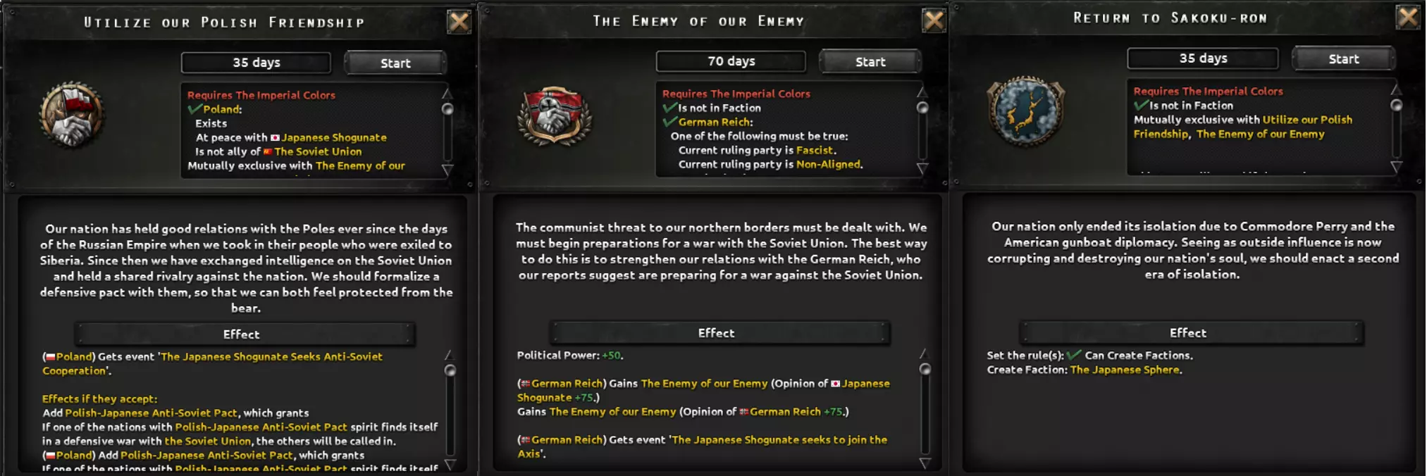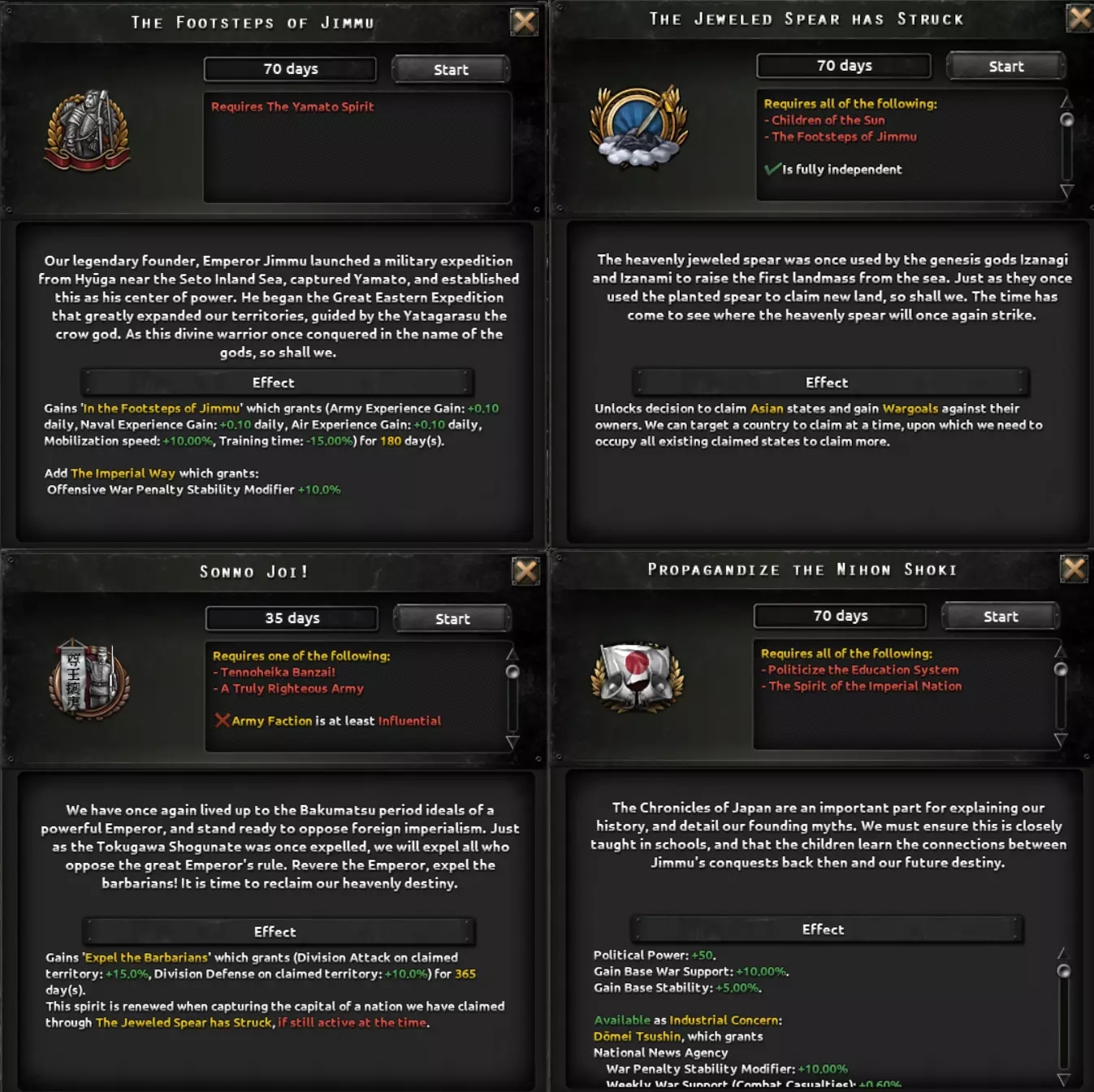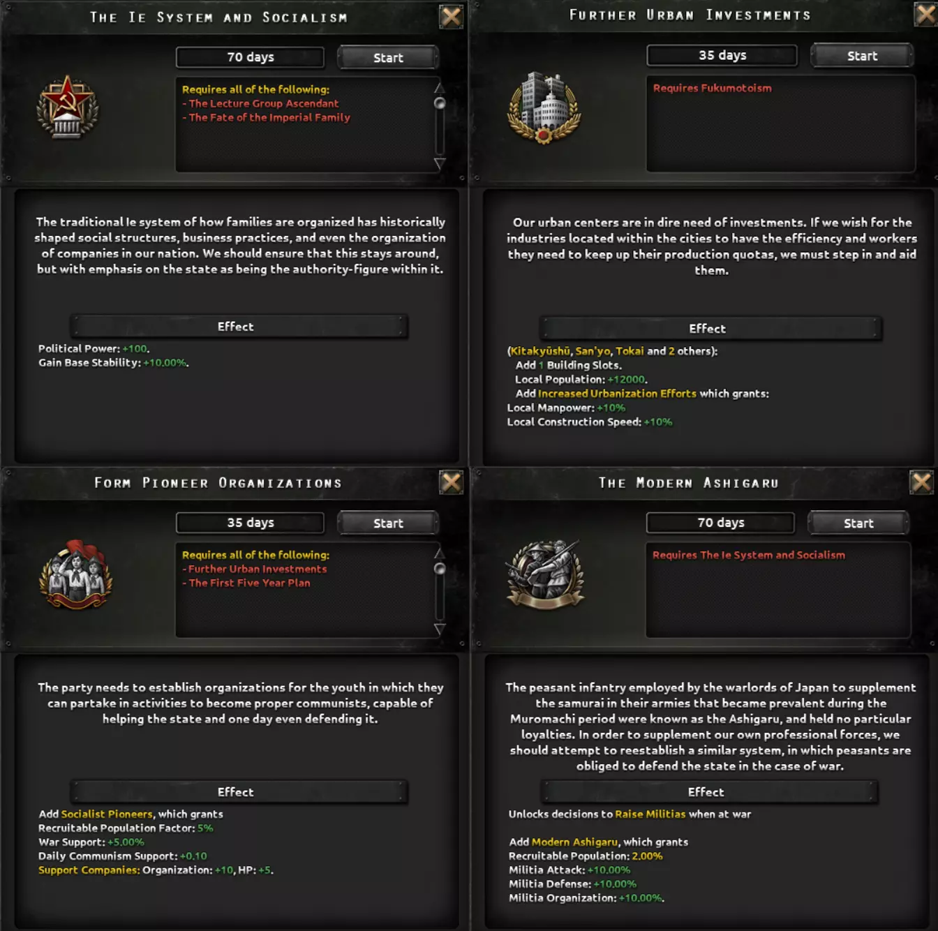 这两条路径都包含一个子分支,涉及对一个深陷帝制与封建制度数百年的社会进行重组。该分支要处理君主制问题、明治时期崛起的寡头势力、投靠军国主义者的叛徒以及落后的教育体系,最终形成以强大工业为核心的发展方向,这将提供足够的追赶动力,以弥补其失去的时间。