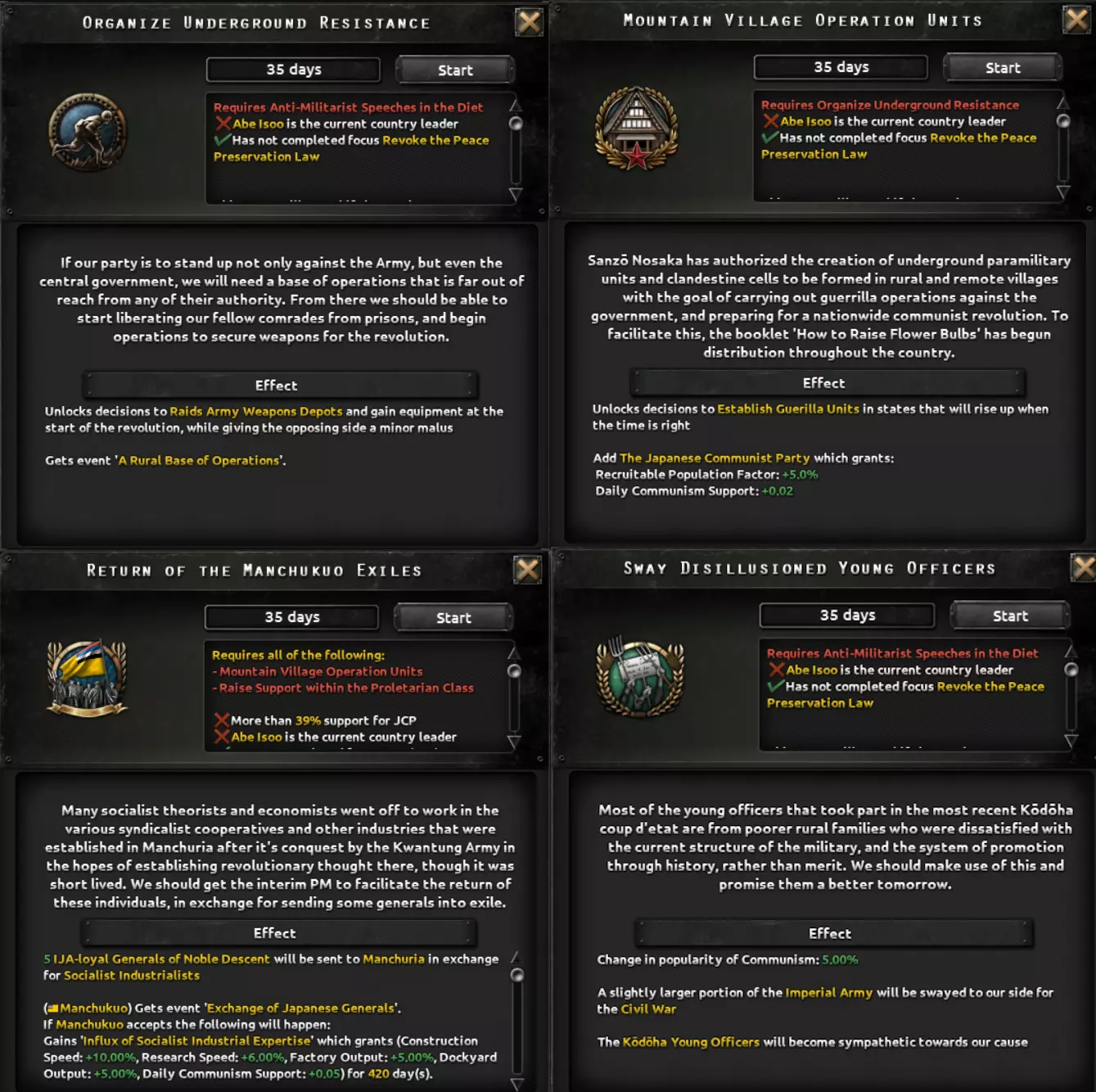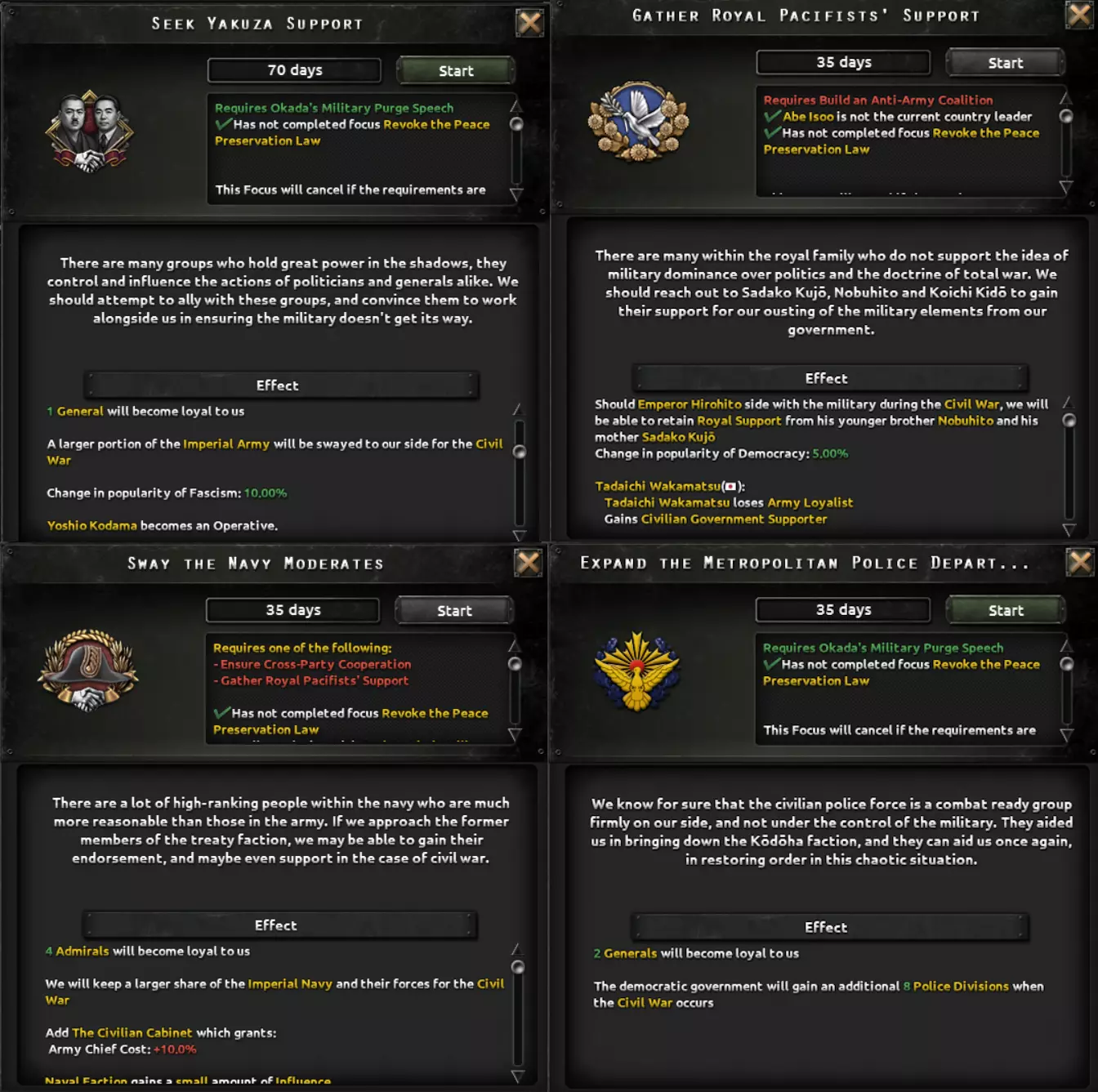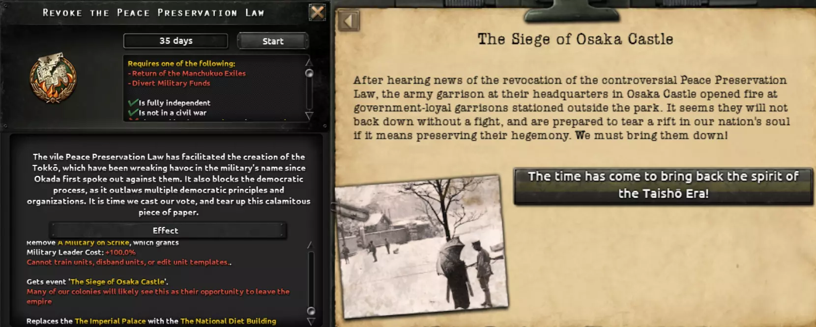 好久不见,欢迎回到另一篇日本开发日志。这次我,D3vil,将展示日本在即将推出的DLC【绝不妥协,绝不投降】中可以选择的架空历史路线。如果你错过了历史路线和普通路线,或者想在阅读本日志前再回顾一下,可以去那里查看。 皇道派路线 我们今天首先来讨论与你已见过的路线最相似的一条,即皇道派路线。此前,该路线仅允许执行北进战略,以及建立以天皇为核心的不结盟日本。不过这与皇道派的理念并不完全相符,而你将通过在上一篇开发日志和开发角落中展示的“政变企图”任务结束时触发的事件中选择以下选项来掌权。
